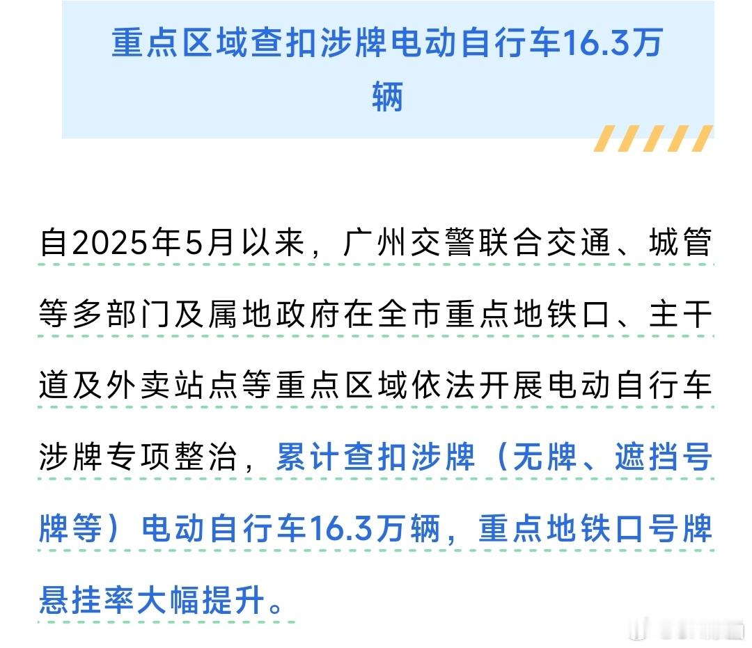 广州是有在管电鸡的。▷ 自2025年5月以来,广州交警累计查扣涉牌(无牌、遮挡号牌等)电动自行车16.3万辆,重点地铁口号牌悬挂率大幅提升。▷ 对轻微违法行为实施现场劝导教育,组织违法驾驶人参与路口文明劝导、观看警示教育视频累计25.3万宗。只是,一年不到的时间,几十万的违法行为,触目惊心啊!光靠人治肯定是不够的,处罚标准还得再提高。现在广州路上还有一堆没牌、遮挡号码牌、不戴头盔的电鸡,现行的管理措施威慑力严重不足。