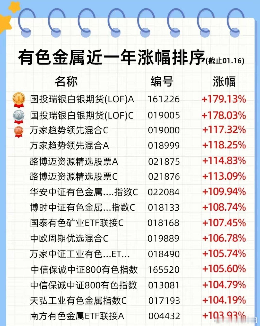 有色金属近一年涨幅亮眼,白银更是一骑绝尘!2026年开年仅半月,有色金属板块便强势爆发,在金属期现货价格双双刷新新高、资金持续进场、产业端需求旺盛等多重利好共振下,板块行情一路走高,相关基金表现抢眼,整体呈现量价齐升、资金扎堆布局、板块内结构分化的鲜明态势。
