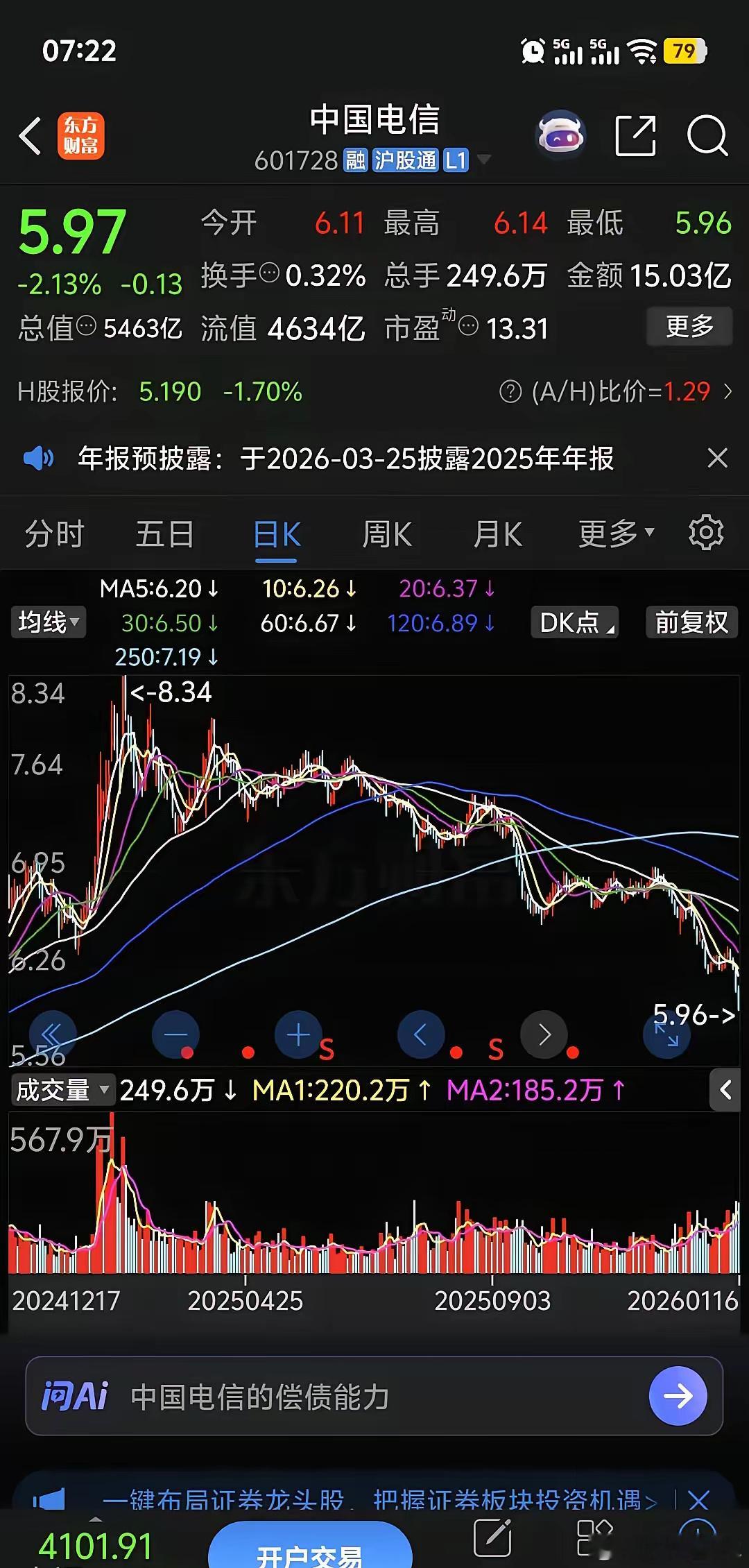中国电信这波操作,属实是有点看不懂了。周五那根大阴线,跟瀑布似的,直接把人浇懵了。高开低走,一路狂泻,最后连6块钱的底裤都给扒了,成交额干到15亿,这得有多少人含泪割肉啊?怪怪的,明明号称天天几万亿的大牛市,怎么这浓眉大眼的蓝筹股反而连续跌了4天?业绩也没拉胯,三季报利润还涨了5%,市盈率才13倍出头,股息率都快干到4.6%了,比放银行香多了。难道这就是传说中的“价值投资者的坟场”?别人贪婪我恐惧,别人恐惧我……也跟着恐惧了?有时候真觉得,股市里谈价值,就像跟渣男谈感情,伤心又伤身。这水太深了,一般人还真把握不住。