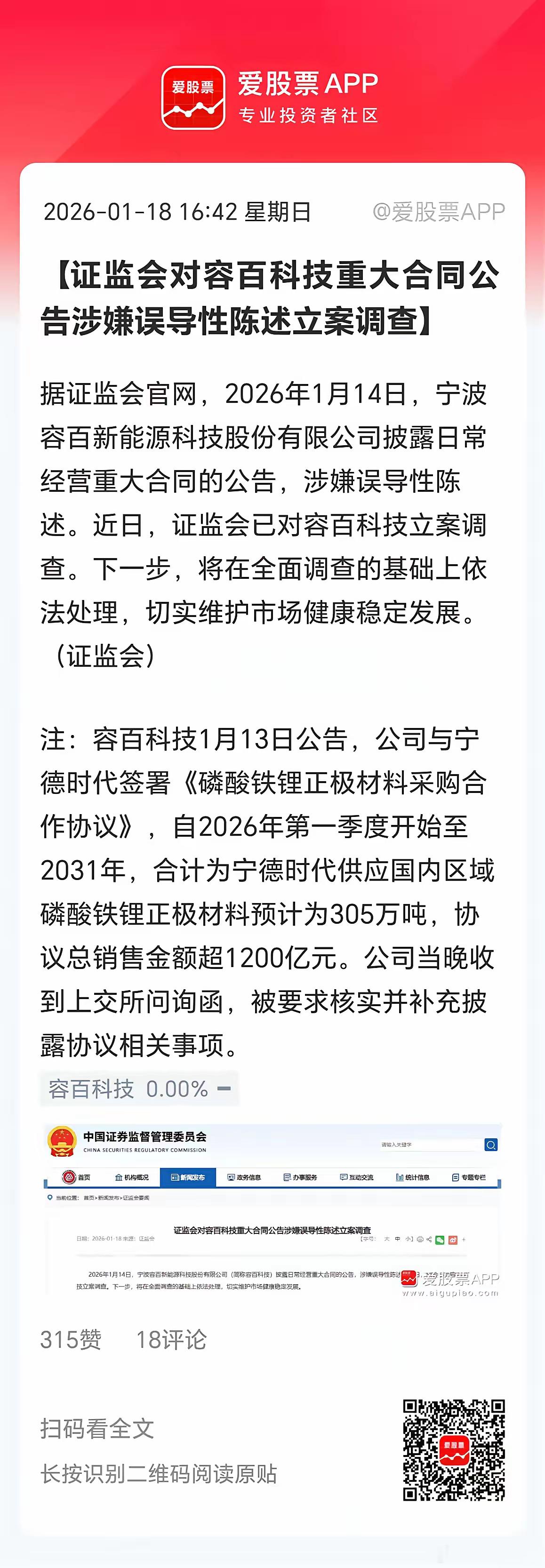 容百科技前几天跟宁德时代签了大合同,1200亿,震惊了整个市场!很快遭上交所火速问询,今天又因为涉嫌误导被证监会立案调查。所以,这千亿订单到底有没有?可能是吹牛逼了,动不动就千亿,你咋不上万亿呢。总之,上市公司要老老实实做实体,不允许蹭题材。公告不能夸大,不然可能吃不了兜着走。容百科技的4万股东懵逼了,本来等着复牌数涨停板,现在感觉不跌就不错,这心情过了一趟巨大的山车啊!