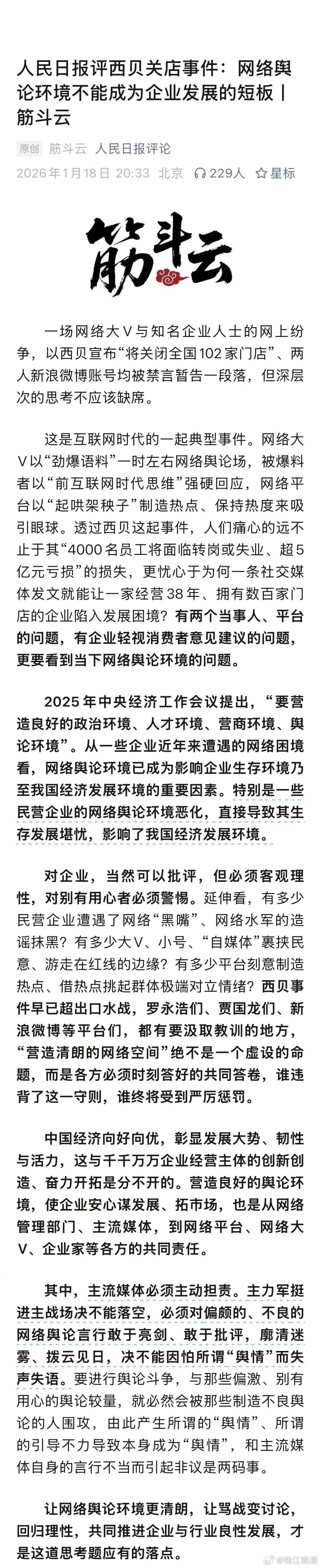 【#人民日报评西贝关店事件#:网络舆论环境不能成为企业发展的短板】#人民日报评西贝事件早已超出口水战# 1月18日,人民日报发布评论文章《网络舆论环境不能成为企业发展的短板》,以下为评论全文:一场网络大V与知名企业人士的网上纷争,以西贝宣布“将关闭全国102家门店”、两人新浪微博账号均被禁言暂告一段落,但深层次的思考不应该缺席。这是互联网时代的一起典型事件。网络大V以“劲爆语料”一时左右网络舆论场,被爆料者以“前互联网时代思维”强硬回应,网络平台以“起哄架秧子”制造热点、保持热度来吸引眼球。透过西贝这起事件,人们痛心的远不止于其“4000名员工将面临转岗或失业、超5亿元亏损”的损失,更忧心于为何一条社交媒体发文就能让一家经营38年、拥有数百家门店的企业陷入发展困境?有两个当事人、平台的问题,有企业轻视消费者意见建议的问题,更要看到当下网络舆论环境的问题。2025年中央经济工作会议提出,“要营造良好的政治环境、人才环境、营商环境、舆论环境”。从一些企业近年来遭遇的网络困境看,网络舆论环境已成为影响企业生存环境乃至我国经济发展环境的重要因素。特别是一些民营企业的网络舆论环境恶化,直接导致其生存发展堪忧,影响了我国经济发展环境。对企业,当然可以批评,但必须客观理性,对别有用心者必须警惕。延伸看,有多少民营企业遭遇了网络“黑嘴”、网络水军的造谣抹黑?有多少大V、小号、“自媒体”裹挟民意、游走在红线的边缘?有多少平台刻意制造热点、借热点挑起群体极端对立情绪?西贝事件早已超出口水战,罗永浩们、贾国龙们、新浪微博等平台们,都有要汲取教训的地方,“营造清朗的网络空间”绝不是一个虚设的命题,而是各方必须时刻答好的共同答卷,谁违背了这一守则,谁终将受到严厉惩罚。中国经济向好向优,彰显发展大势、韧性与活力,这与千千万万企业经营主体的创新创造、奋力开拓是分不开的。营造良好的舆论环境,使企业安心谋发展、拓市场,也是从网络管理部门、主流媒体,到网络平台、网络大V、企业家等各方的共同责任。其中,主流媒体必须主动担责。主力军挺进主战场决不能落空,必须对偏颇的、不良的网络舆论言行敢于亮剑、敢于批评,廓清迷雾、拨云见日,决不能因怕所谓“舆情”而失声失语。要进行舆论斗争,与那些偏激、别有用心的舆论较量,就必然会被那些制造不良舆论的人围攻,由此产生所谓的“舆情”、所谓的引导不力导致本身成为“舆情”,和主流媒体自身的言行不当而引起非议是两码事。让网络舆论环境更清朗,让骂战变讨论,回归理性,共同推进企业与行业良性发展,才是这道思考题应有的落点。(来源:人民日报评论)
