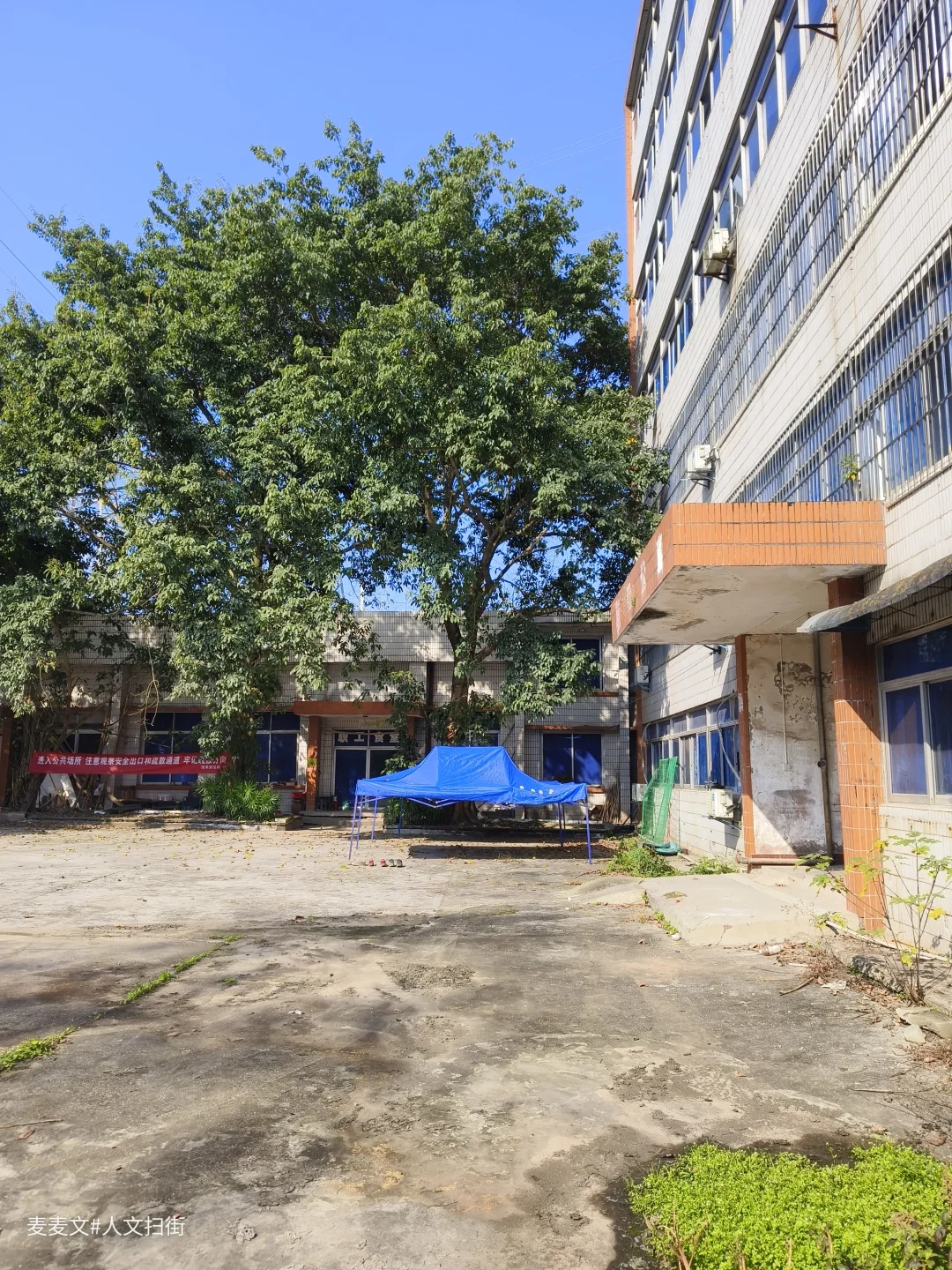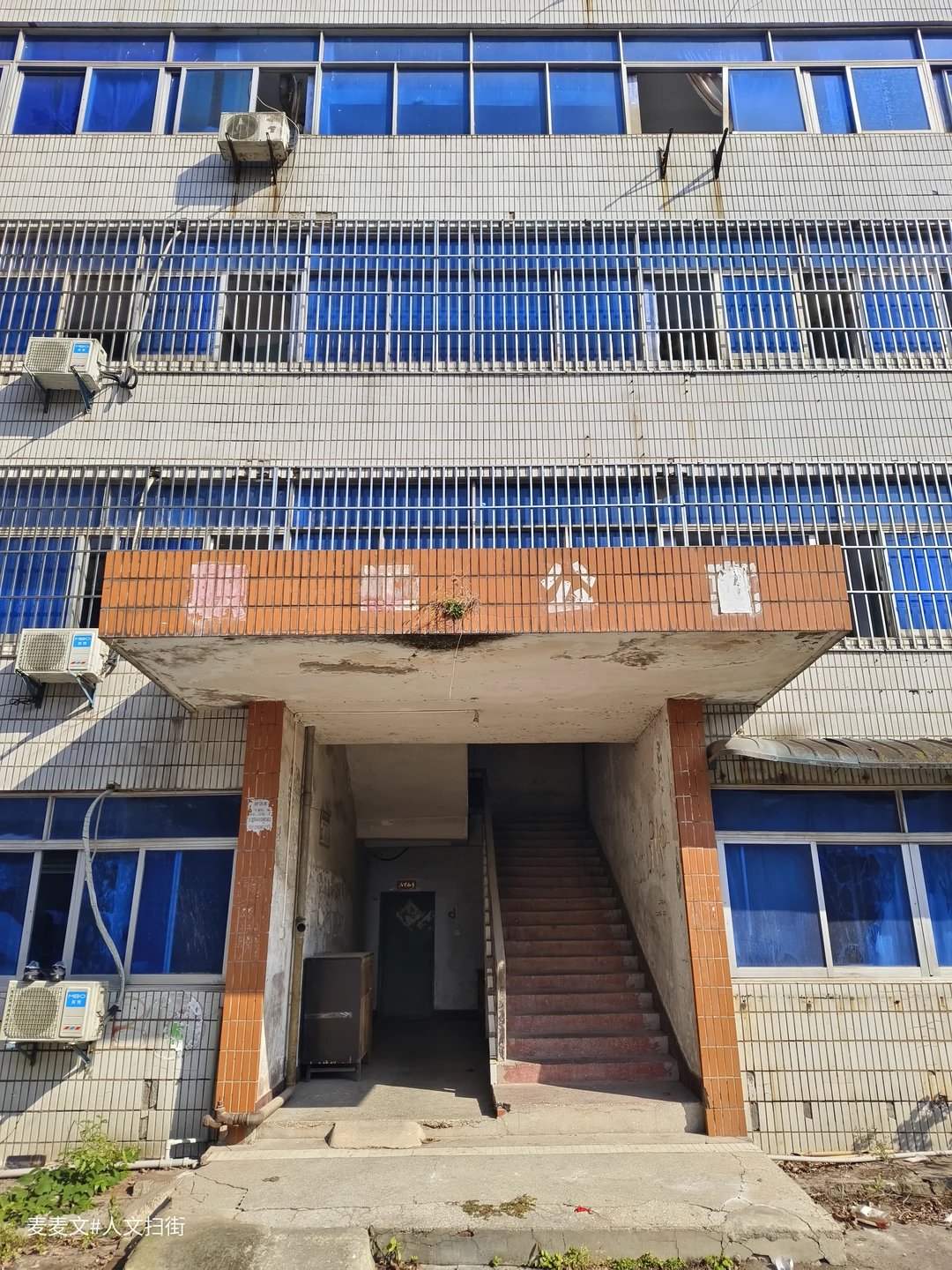 这栋楼是典型的90年代末至2000年初的老工业办公楼风格。方正的楼栋轮廓,大面积蓝色反光玻璃搭配白色小方格瓷砖,红棕色的腰线与门廊点缀,带着那个时代工业建筑的实用与直白,空调外机嵌在窗沿,铁栅栏守着窗棂,处处是大厂办公区的印记。