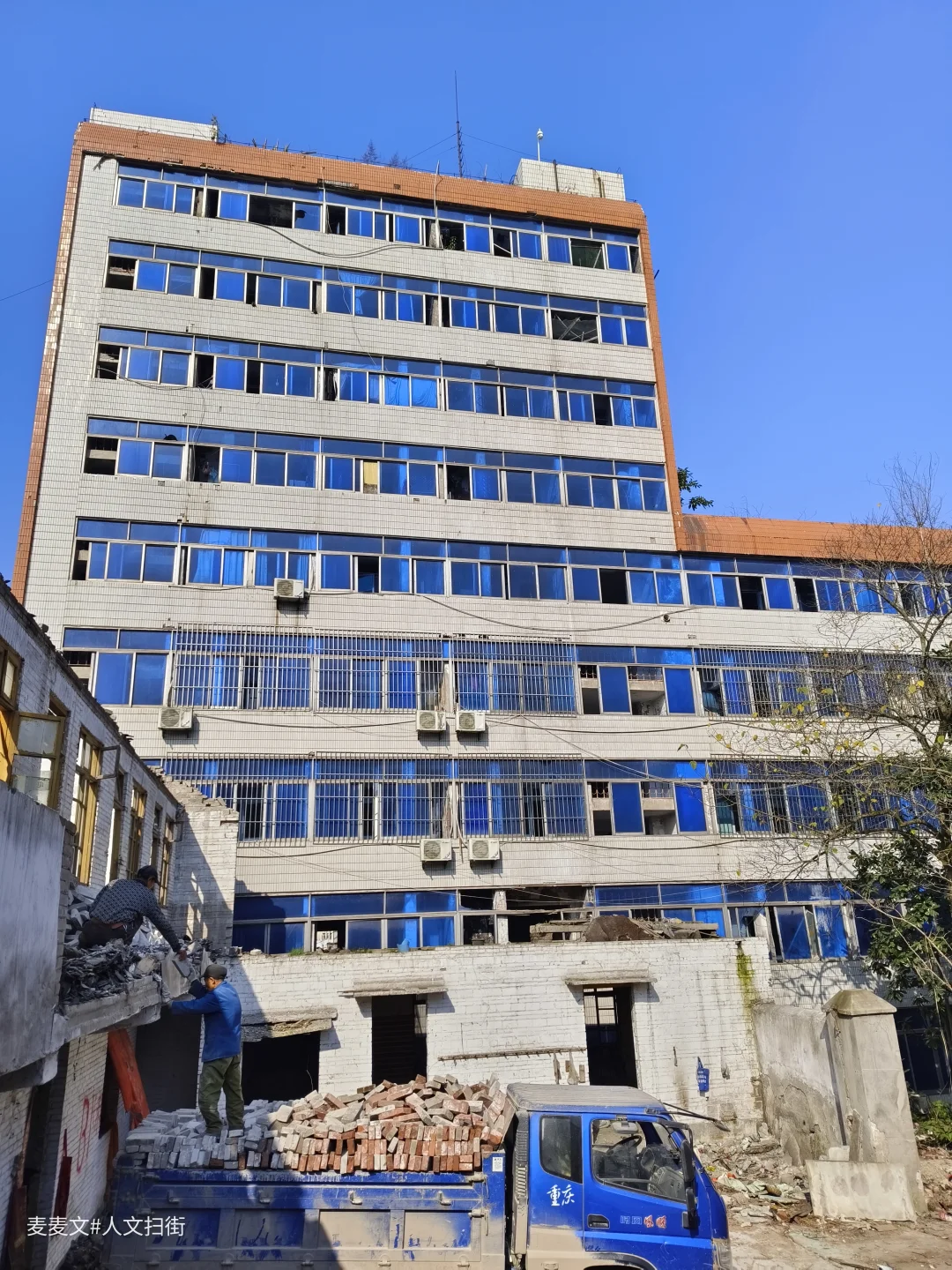 在重庆市两江新区(渝北区)悦来街道狮子口大桥旁,撞见了原江北煤矿(江合煤化)的老办公楼。蓝色玻璃幕墙在阳光下晃着光,墙体的白瓷砖却蒙了岁月的灰。已拆除的砖瓦堆在楼前,更衬得这几栋千禧年风格的建筑满是沧桑。