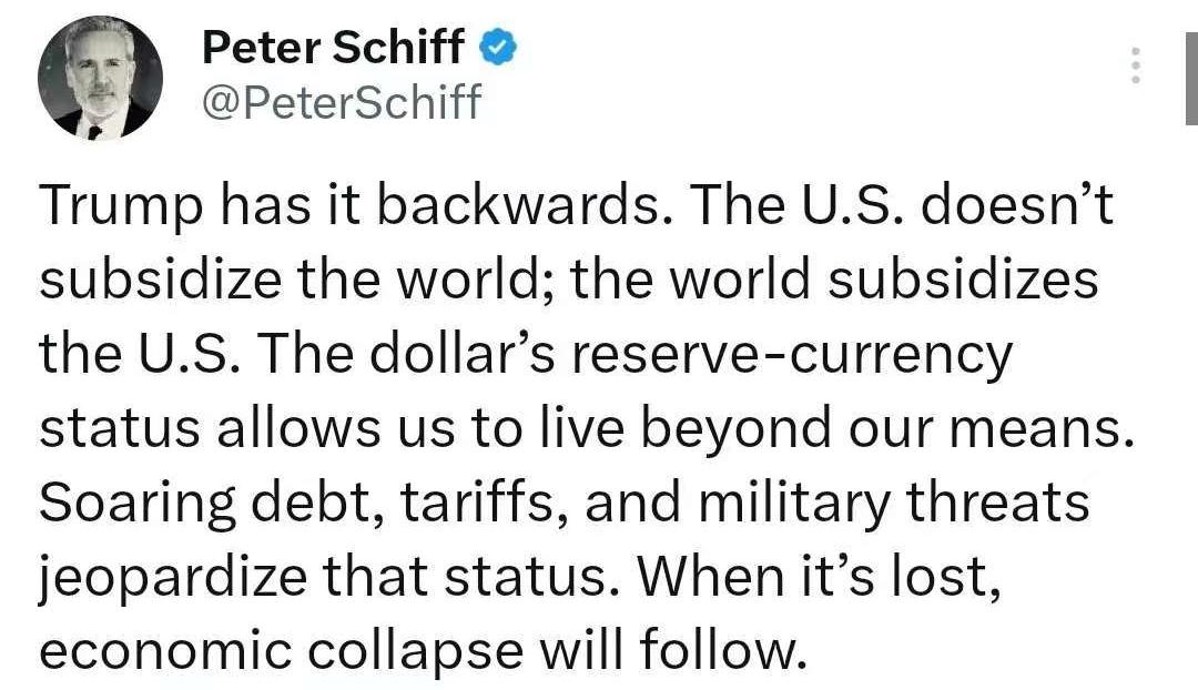 1月18日,美国知名经济学家彼得·希夫发文:“特朗普颠倒黑白,不是美国补贴世界,而是正相反,美元的储备货币地位使我们的生活入不敷出,飙升的债务,关税和军事威胁正在危及这一地位,一旦失去储备货币地位,经济将崩溃!” [机智]彼得·希夫的直言,道破了美元霸权的本质真相!二战后美元的储备货币地位,让美国坐拥铸币税特权,靠印钞收割全球财富、维持入不敷出的生活,所谓美国补贴世界不过是霸权的虚伪说辞,特朗普政府的疯狂举债、滥挥关税大棒、动辄军事威胁,正持续透支美元信用,多国加速去美元化已是明证。美元霸权从不是永恒的,当美国亲手摧毁全球对其货币的信任,失去储备货币地位的那天,便是其经济泡沫破裂的开始,这是霸权透支的必然代价,更是世界经济摆脱美元绑架的历史必然!