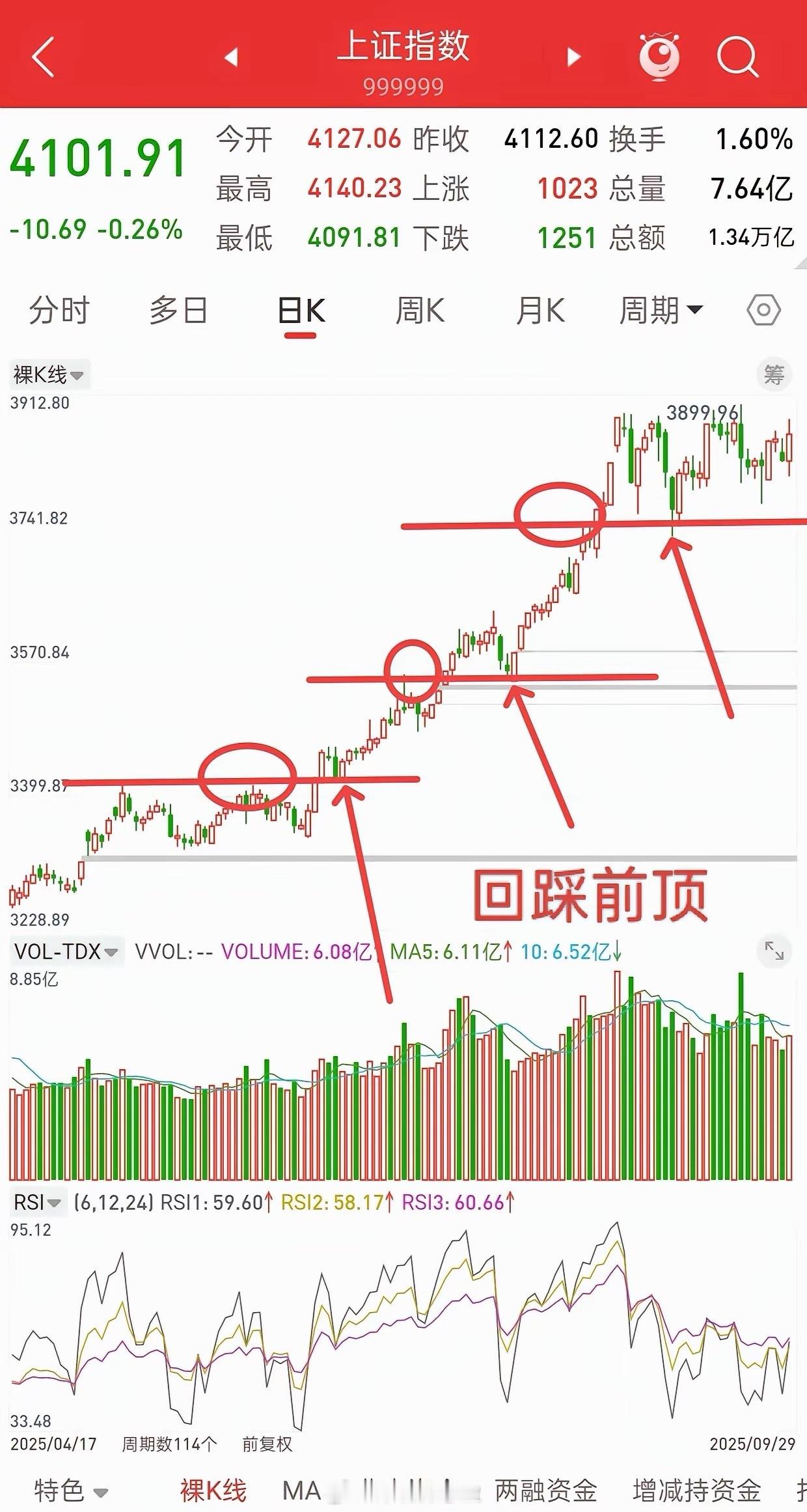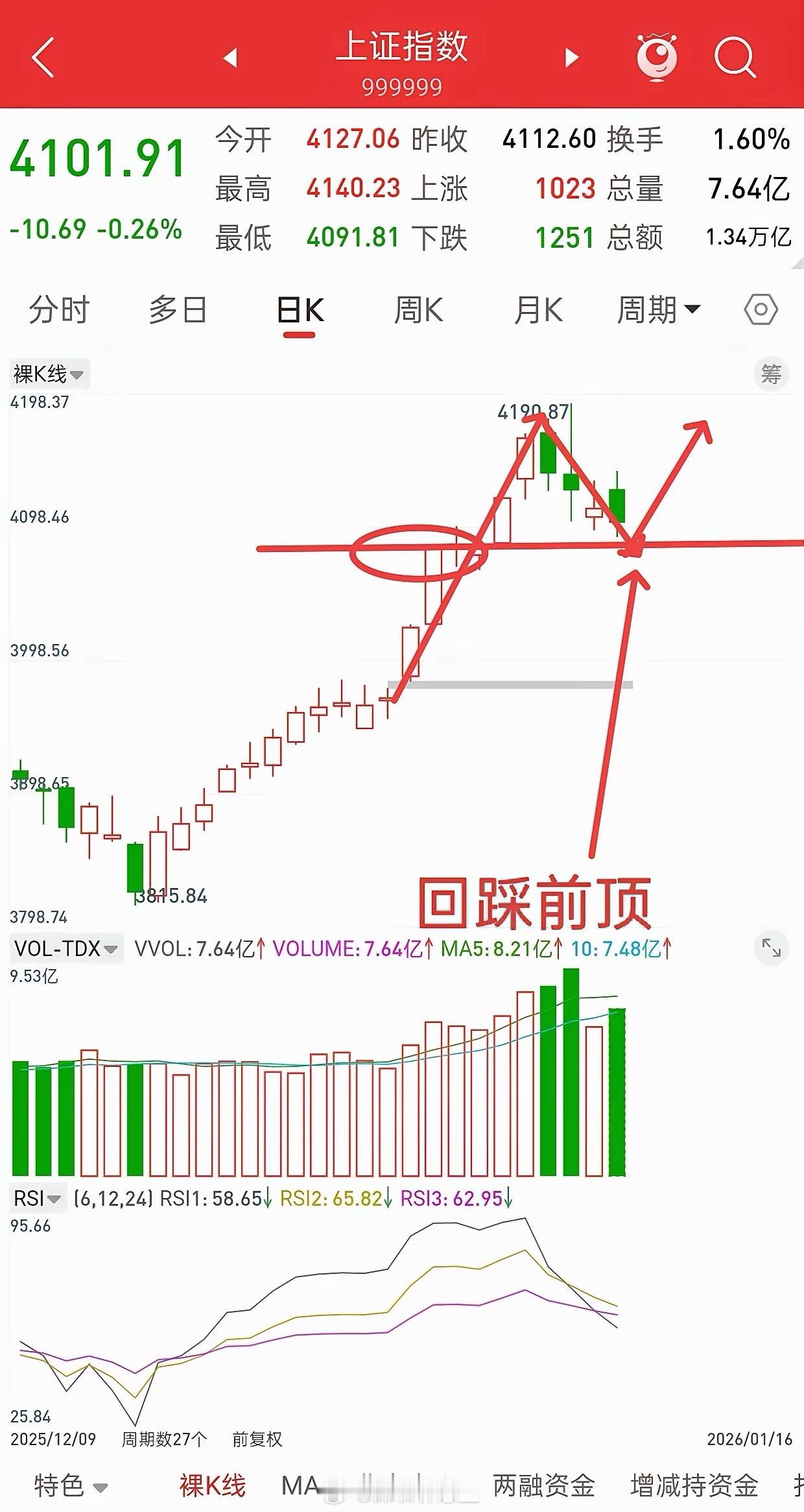 在A股市场里,每一根K线,都会说话的!1.5号高点4025,低点3983,12.29号高点3983,1.6号低点4025。是巧合吗?如果是巧合,为什么去年从6-8月上涨趋势中,期间每一次回踩都是回踩前顶附近,就止跌反弹了呢?如果是巧合,为什么很多个股,像底部龙回头,回踩前顶附近,就开启第二波拉升了呢?均线也许会诱多或诱空,但是K线几乎不会,因为它是主力的成本区域。所以,这几天我一直看下周一,也就是明天,会打个低点,然后开启第二波拉升,而且很有可能,这个低点就在明天早上十点半之前,压根不会给第二次上车机会。会不会这样走,明天可以拭目以待!