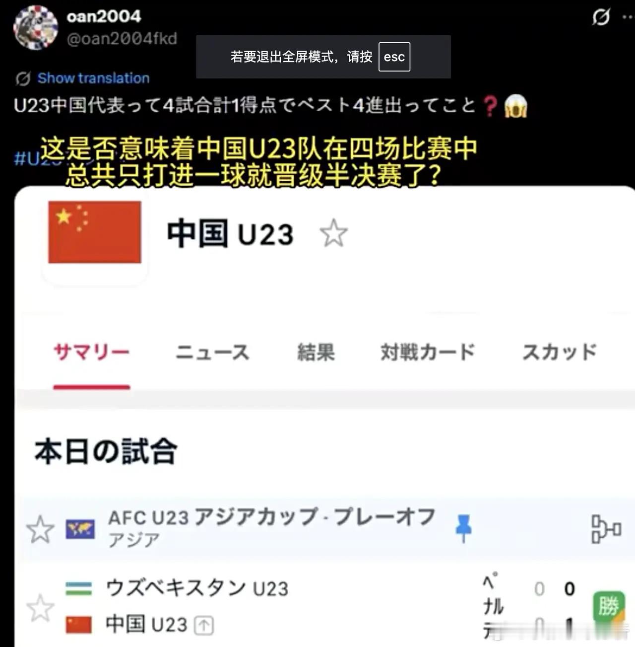 日本球迷惊呆:中国队4场1球进了4强?刘建宏:我们愿一直苟着?1月17日晚,U23亚洲杯的赛场上,中国队创造了神迹。在全场被动的情况下,U23国足神奇杀入半决赛。整个亚洲足坛为之震动。蛰伏多年,中国青年足球真的要绽放了?中国队的实力远在乌兹别克斯坦之下。安东尼奥非常清楚这一点,所以他从比赛的第一分钟开始就让中国球员全线退防,几乎放弃了进攻。依靠全队的铁血防守以及李昊的持续开挂,中国队最终在点球大战中4-2晋级。这届亚洲杯上,中国队一直在书写历史。小组赛阶段,中国队1胜2平,分别是0-0战平伊拉克、1-0澳大利亚、0-0泰国,队史首次闯入到8强。如今,中国队又在全亚洲小伙伴的惊愕声中首次拿到半决赛的入场券。外界惊叹中国队的不只是进入半决赛的结果,还有其4场比赛只打进1球的进攻火力。在社媒上,日本球迷简直不敢相信这个结果:“这是否意味着中国U23队在4场比赛中一共就进了1球,然后进入了半决赛?”对于U23国足的防守战术,名嘴刘建宏发表了他的观点:“要感谢安东尼奥在这一届比赛里边把中国队打造成了一个铁血的战队。中国队在场上非常非常的能够拼,能够抢。我希望大家也不要忘了,我们的控球仍然被人家拉出了六成的差距。”“我们跟一个标准的乌兹别克的U21球队都还是有差距的。也许未来的相当长的一段时间里,中国队也只能用这样的一种方式在亚洲足坛和强队周旋吧。”虽然直言中国队现在只能这么踢,但刘建宏还是不甘心:“如果我们不能诞生那种顶级的优秀球员,那我们就始终会这么一直苟下去。我们得问一下我们自己,我们愿意一直这么苟着吗?”