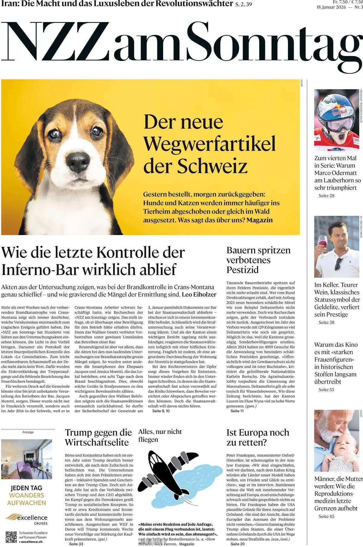《新苏黎世报》头版报道称,瑞士新的“一次性用品”。 昨天订购,明天归还:狗和猫