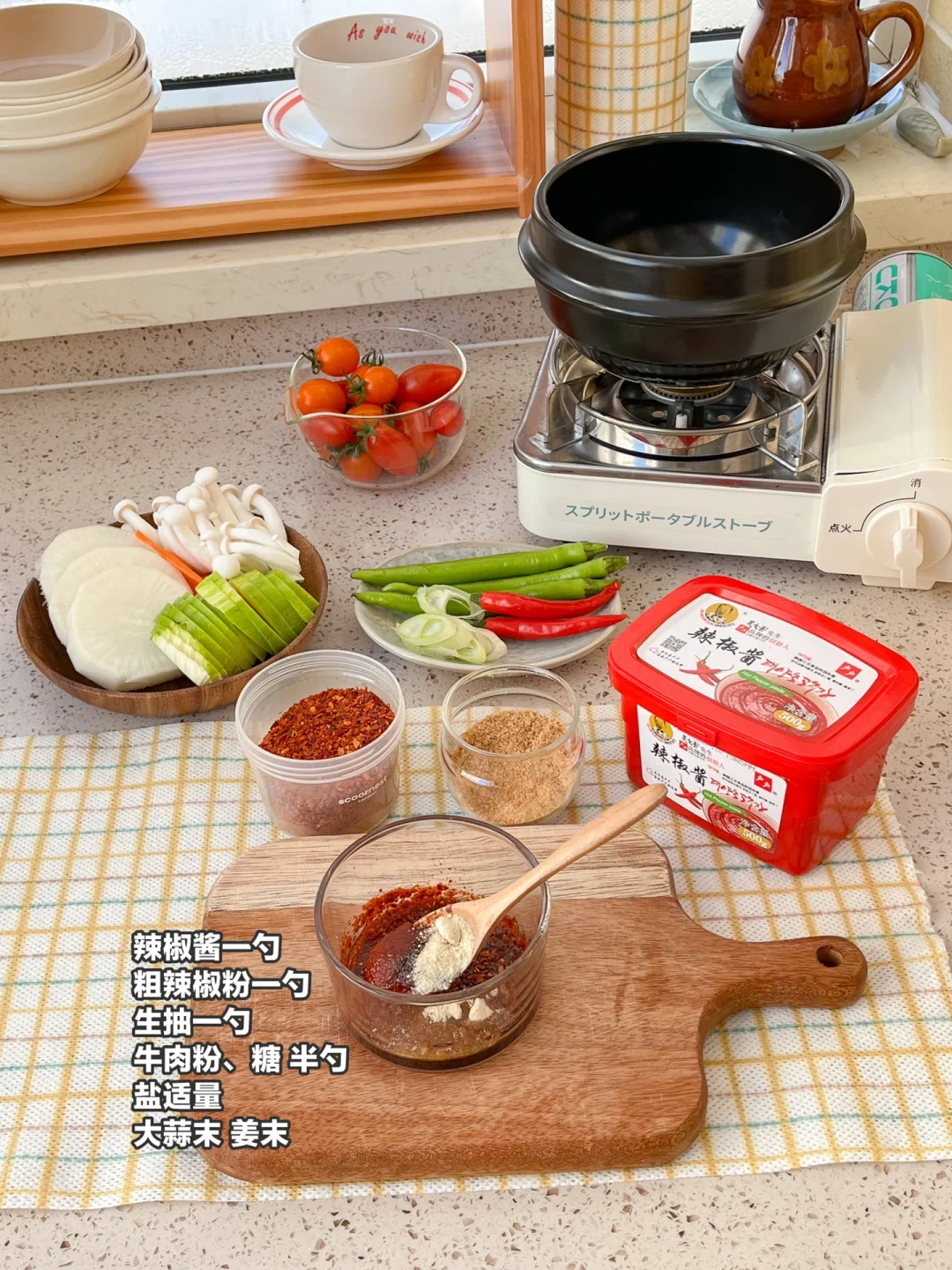 韩式辣酱一勺、粗辣椒面一勺、生抽一勺