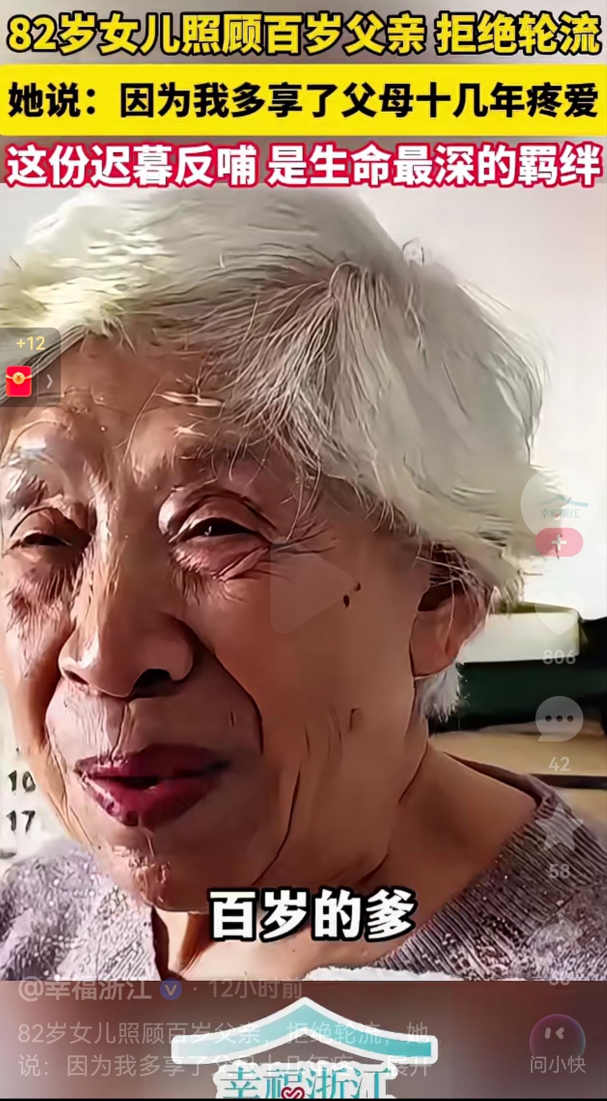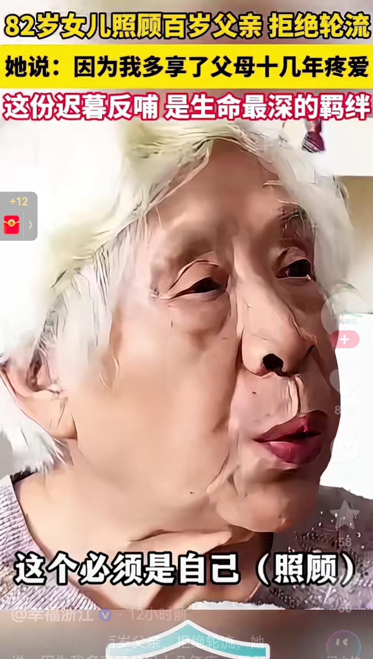 太孝顺了!82岁女儿照顾百岁父亲,虽然有兄弟姐妹,她却拒绝轮流照顾,因为,她不想给父亲带来心理伤害。网友:这才是真正的孝顺!不是分摊任务,是记着父母的好,心甘情愿回报。 82岁的女儿一个人在伺候自己100岁的父亲呢。为什么会这样呢?原来,当这位百岁老人的子女提出轮流赡养时,这位头发花白的女儿却坚定地拒绝了:“这个必须是自己照顾,几个孩子我也不希望轮流。” 她给出的理由很简单:“因为我比弟弟妹妹年长了十几岁,多享了父母十几年疼爱,这叫恩德吧。” 原来,作为家里的大姐,她比家里的三个弟弟妹妹们分别大了8年、12年甚至14年,这一段他们是永远也追不上,所以她享受到了更多的陪伴和关爱。 她还记得父亲当年“什么都没耽误过我”,所以现在,她要把这份爱加倍偿还给父亲。 她还说:“这一个星期或者一个月,到这家到那家,老人的心里会有一些障碍。” 在她看来,轮流照顾会让父亲失去安全感,而只有固定的陪伴,才能让老人安心。她太懂父亲需要什么了,不是轮流的“任务”,而是一个熟悉的、稳定的依靠。 当小弟弟听到她这番话时,他特别感动,也更加理解了大姐的选择。 网友看到后评论说:“82岁还能照顾100岁的父亲,这本身就是福气啊,大姐又善良又有福气。” 还有的网友说:“大姐格局太大了!多享了十几年疼爱,就多担十几年责任,这才是亲情该有的样子。” 这位82岁的老人用自己的实际行动告诉我们:孝顺不是任务,而是心甘情愿的回报。 她没有说我应该,而是说我愿意,她没有抱怨为什么是我,而是感恩“我多享了十几年疼爱”。 其实,真正的爱就是“你陪我长大,我陪你变老”的双向奔赴。父母给我们的爱,是不计成本的。我们给父母的回报,也应该是心甘情愿的。 这位82岁的女儿,用她的选择告诉我们:亲情里没有公平,只有我愿意。 你多享了爱,就多承担责任。你多陪伴了父母,就多一份心安。