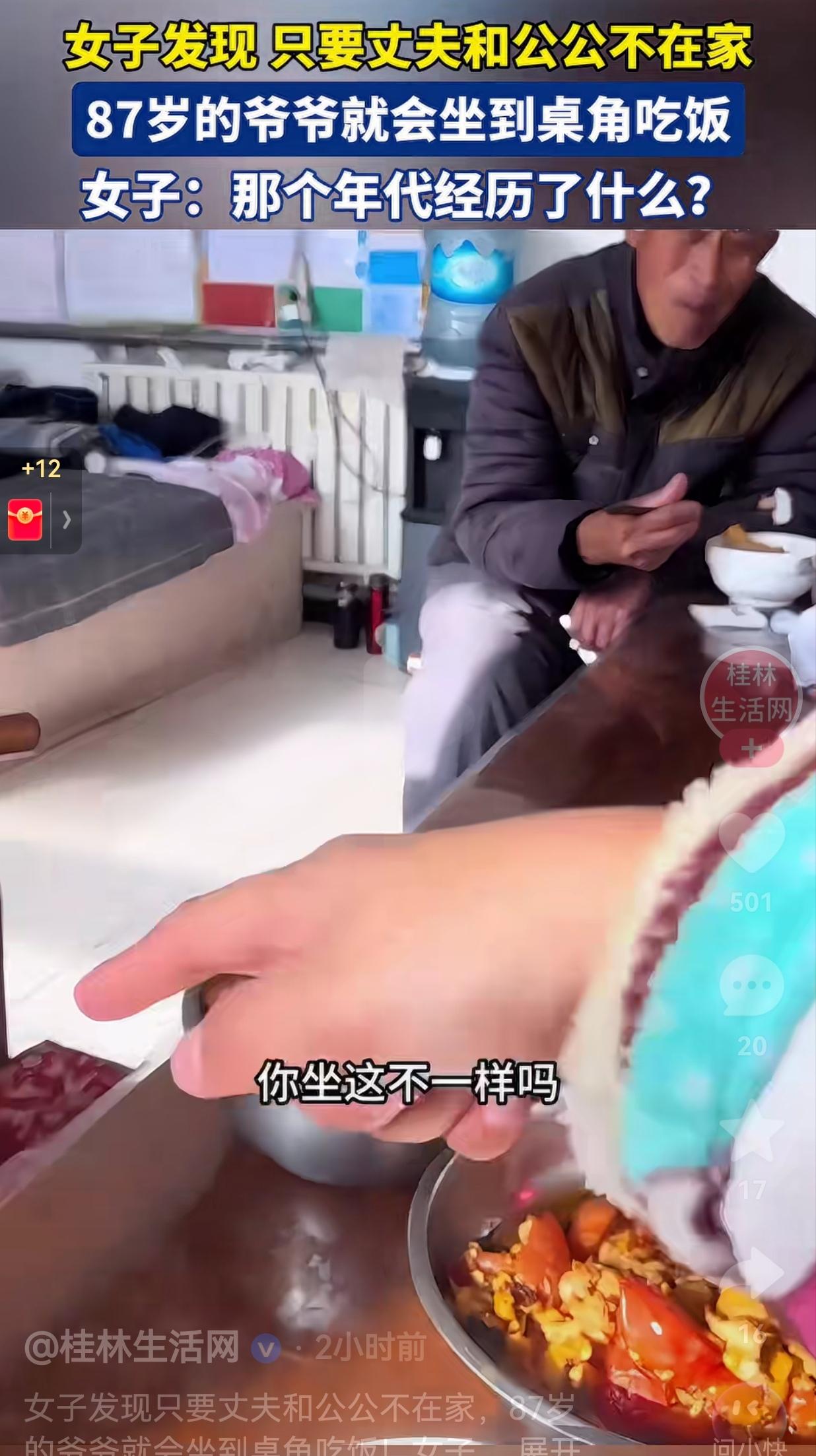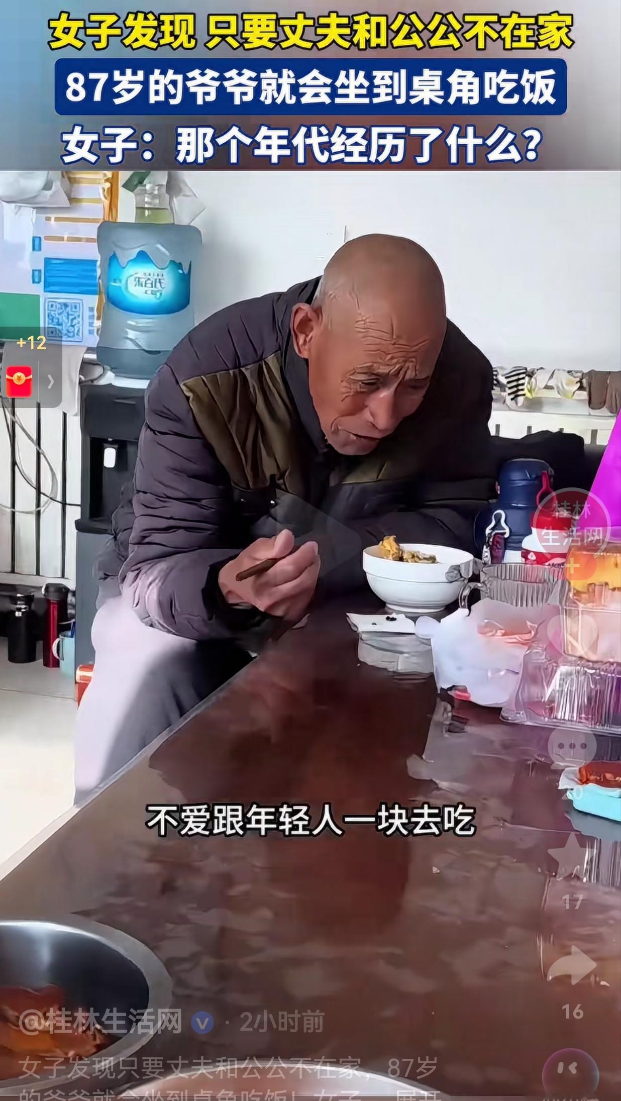 这天女子的丈夫和公公不在家吃饭,中午到了,女子给爷爷做好了午饭,等女子把饭端给爷爷时,她竟然发现,87岁的爷爷正一个人缩在餐桌的角落里吃饭,碗里的饭菜很简单。 一旁的孙媳妇忍不住问:“爷爷你为什么吃饭老坐那吃去?你坐这不一样吗?我都给你放好椅子了。” 爷爷低着头,小声说:“不爱跟年轻人一块去吃。” 据女子观察,她发现只有当自己的老公和公公在家时,他才会坐到桌子中间,跟他们一起吃饭,而只要这两个家里的“顶梁柱”不在,老人家就会自觉躲到桌角边,一个人默默地吃饭,仿佛老人家觉得,那里才是他该待的地方。 网友看到后评论说:“看哭了!我爷爷也是这样,只要我爸不在家,他就端着碗蹲在门口吃,让他回来吃饭,他就说不占地方。” 还有的网友说:“孙媳妇好暖心!还能注意到爷爷的小习惯,好多人根本没察觉老人在小心翼翼迁就。” 看完这个视频,我心里又暖又堵。暖的是,孙媳妇能注意到爷爷的习惯,还主动给他搬椅子,能看出孙媳妇对爷爷特别孝顺。 堵的是,爷爷那刻在骨子里的懂事,真的太心酸了!他哪里是不爱跟年轻人吃饭,而是觉得自己不该占着主位,更不想给晚辈添麻烦。 其实,我们总以为“孝顺”是给老人买好吃的、买新衣服,却忘了他们最需要的,是被当成“家人”而不是“客人”。