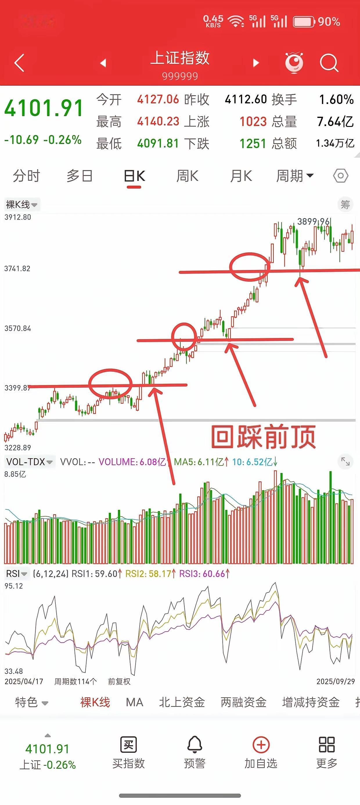 在A股市场里,每一根K线,都会说话的! 1.5号高点4025,低点3983,12.29号高点3983,1.6号低点4025。 是巧合吗?如果是巧合,为什么去年从6-8月上涨趋势中,期间每一次回踩都是回踩前顶附近,就止跌反弹,所以这里就体现了趋势延续中的市场共识——前期高点经过消化后,容易成为多方认可的支撑位,反映出资金对趋势的延续性存在一定预期。 不过,市场走势受多重因素影响,历史规律并非绝对,投资者还需结合宏观环境、板块逻辑等综合判断,避免单一技术信号主导决策。