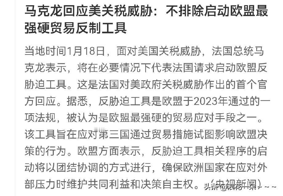 彻底被打醒了? 马克龙回应美国关税威胁,不排除启动欧盟最强硬贸易反制工具。 欧洲一直这么软,早就该醒悟了,川普刚上任就开始收拾欧洲加征关税,那时候还谈判妥协,有个球用,这不,美帝国只会变本加厉! 这次拿格陵兰岛来威胁欧洲,哪怕是两败俱伤,也要对美帝来狠的,否则,美帝下一个对欧洲的套路还不知道是啥呢?所以,马克龙你得带头啊,欧洲就看你了![捂脸] 网友:你们好好打,我们坐小马扎嗑瓜子唠嗑多好!