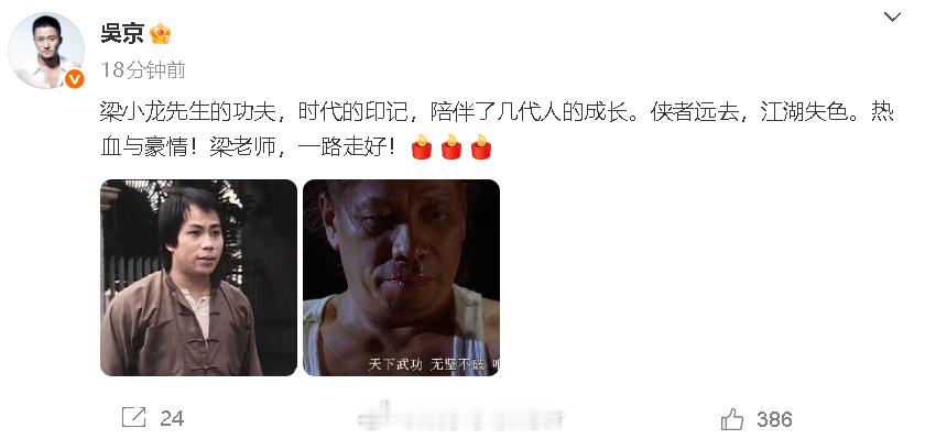 吴京发博悼念梁小龙樊少皇悼念梁小龙 18日,梁小龙去世,吴京发文悼念:“梁小龙先生的功夫,时代的印记,陪伴了几代人的成长。侠者远去,江湖失色。热血与豪情!梁老师,一路走好!” 樊少皇也发博悼念梁小龙:“小龙哥 一路走好🙏 ”