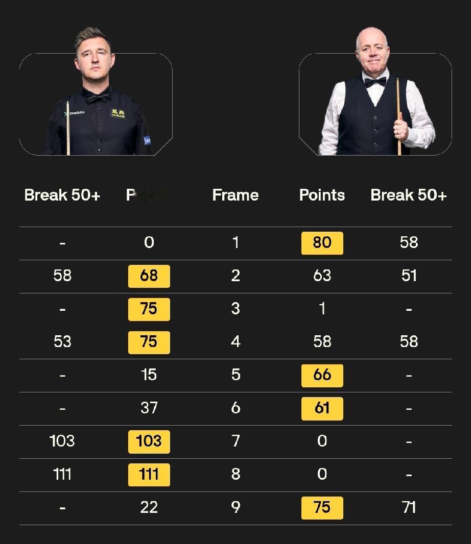 凯伦·威尔逊5-4约翰·希金斯 2816斯诺克大师赛决赛。第一阶段,凯伦威尔逊发挥出色,打出两杆破百两杆50+,5-3领先约翰·希金斯。 第二阶段,约翰·希金斯打出单杆71分追回一局,比分4-5落后凯伦·威尔逊。