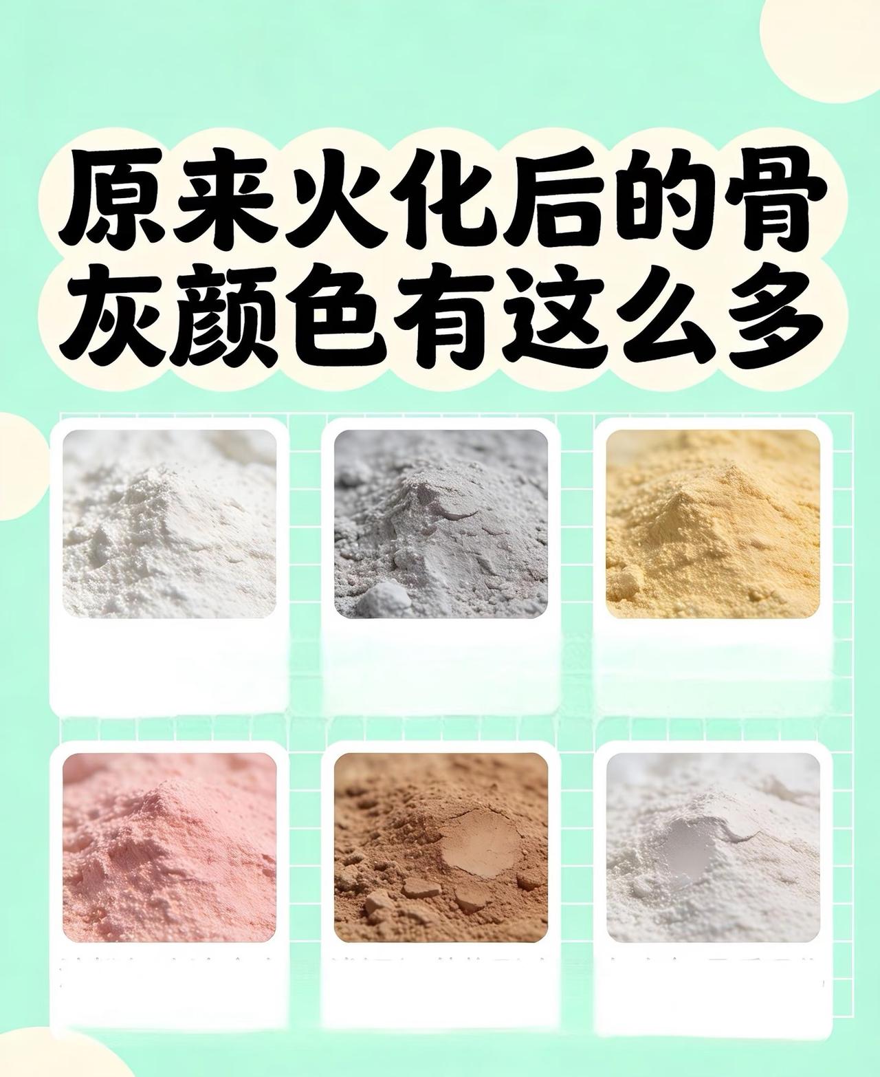 火化后的骨灰并不只有白色的。 很多人以为骨灰都是纯白色的,其实不是!人体火化后常见颜色大盘点: 乳白色/灰白色:常见,代表钙质充足; 淡黄色/米色:正常健康状态; 粉红色:可能因生前服用某些要物; 深灰色/青黑色:常与体内金属含量有关。 关键影响因素: 火化温度:1000℃左右高温下,有机物完全燃烧,留下无机矿物质; 骨骼密度:钙磷比例影响色泽深浅; 生前健康状况:长期服要或疾病会改变骨骼成分; 特殊物品:如补牙金属、手术植入物等。 有意思的是,有些家属会发现零星彩色结晶,那可能是逝者佩戴的饰品在高温下的变化。 每种颜色都是生命的自然印记,没有好坏之分。了解这些后,再看那些细腻的颗粒,仿佛读到了一个人独特的人生故事。 生命如火焰般燃烧殆尽,留下的不仅是回忆,还有这些沉默的“生命密码”。