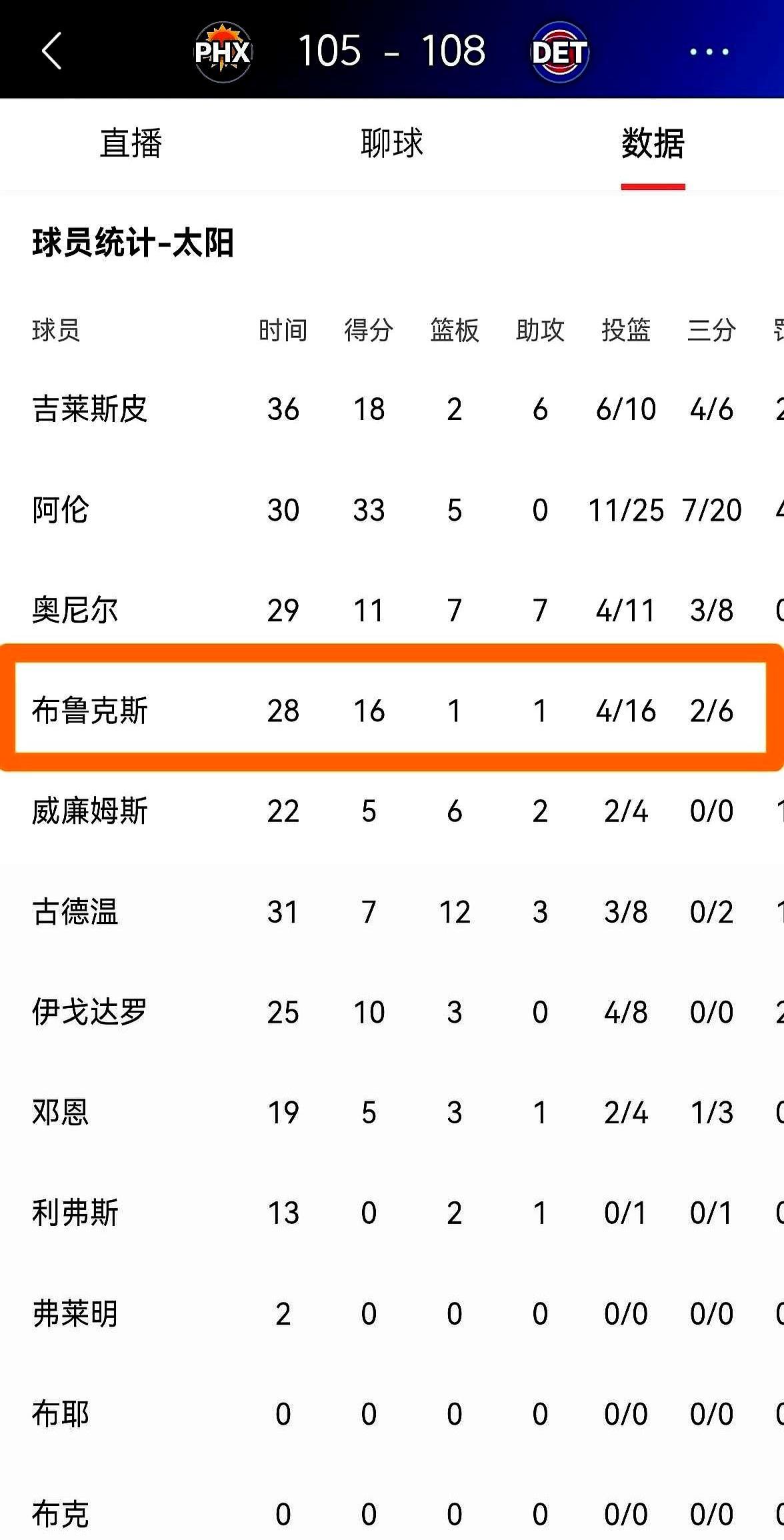 狄龙6犯离场,太阳输3分 29分钟,16投4中,三分6中2,正负值-15全队最差。第四节还剩两分钟,他领到第六次犯规,板凳席只能看着活塞罚球稳住局面。 布克不在,教练把开火权塞给狄龙。球一到他手里,基本就出手,哐哐打铁声比计分器跳得还快。更糟的是,一次一级恶意犯规直接把节奏送给对面。 这赛季他场均21分,三分投得比往年都多,技术犯规也冲到联盟第一。硬是他的招牌,可硬过头就成了双刃剑:防不住脾气,也防不住自己。 太阳现在西部中游,想往上爬,狄龙得学会在强硬和冷静之间找平衡。下次客场,别再让板凳席提前穿上外套。