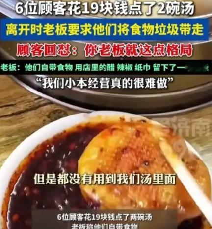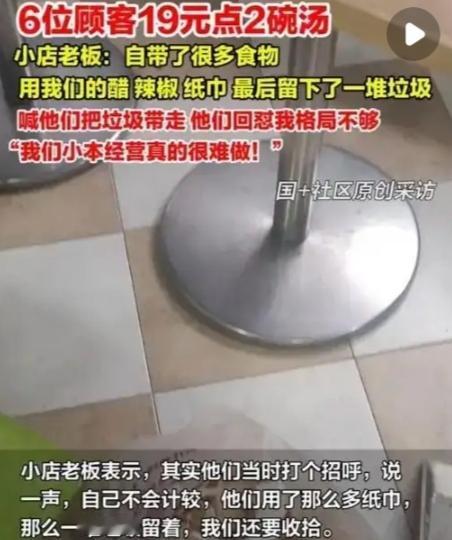6位顾客在上海一家餐馆花19元点了两碗汤,留下大量自带食物垃圾!店老板要求其带走垃圾被怼“就这点格局” 19元,在上海能买到什么?是一杯奶茶的零头,是两站地铁的票价,却成了6位顾客“占尽便宜还理直气壮”的底气。当他们带着大包小包的自带食物走进餐馆,只点两碗汤就霸占餐桌1.5小时,把免费醋喝到见底、辣椒挖空罐底、纸巾用成小山,最后留下满桌狼藉扭头就走时,老板那句“麻烦带走自带垃圾”,竟换来了一句轻飘飘的嘲讽:“就这点格局?” 格局?这两个字从这群顾客嘴里说出来,简直讽刺到骨子里。老板的格局,是凌晨采购新鲜食材的奔波,是顶着房租水电压力的坚守,是面对“外卖白嫖党”仍选择包容的善良。可6位顾客的“格局”,却是花19元就想买断场地使用权、免费耗材使用权,甚至垃圾清运服务的精致利己。他们恐怕忘了,餐馆是做生意的地方,不是免费提供空调、桌椅、调料的公益场地,更不是随意丢弃垃圾的“公共垃圾桶” 。 小本经营的艰难,从来不是没格局,而是“格局不能当饭吃”。老板算过一笔隐形账:19元的汤品利润,可能连被消耗的醋、辣椒和纸巾成本都覆盖不了,更别提1.5小时占用6人座位错失的潜在生意。那些看似“免费”的东西,背后都是老板的真金白银——房租是按月交的,人工是按天算的,就连一包纸巾、一瓶醋,都是日积月累的损耗。网友说得戳心:“老板没直接赶人,已经是最大的格局”,而顾客用“格局”绑架他人的自私,才是最没素质的表现。 更让人不适的是,这场闹剧暴露的不是“抠门”,而是对他人劳动的漠视。自带食物就餐本无可厚非,很多老板都会体谅顾客的精打细算,但体谅是相互的——提前打个招呼,少用点免费耗材,餐后顺手带走自己带来的垃圾,这些举手之劳的小事,恰恰是素质的试金石。可这6位顾客却把老板的包容当成理所当然,把自己的自私包装成“不拘小节”,用“格局”二字堵住老板的合理诉求,本质上就是“我占便宜可以,你计较就是你小气”的双标绑架。 法律早已明确,产生生活垃圾的单位和个人是分类投放的责任主体,自带食物产生的垃圾,本就该由消费者自行处理。老板的要求不仅合情合理,更是在维护最基本的经营秩序。那些嘲讽老板“没格局”的人,不妨换位思考:如果你的心血被肆意消耗,你的付出被当成理所当然,你还能笑着说“没关系”吗?小餐馆的烟火气,靠的是老板的坚守,更靠顾客的尊重;社会的温度,从来不是单方面的让步,而是你体谅我的不易,我珍惜你的付出 。 19元引发的“格局之争”,说到底是一场关于尊重的考题。顾客花了钱,享受的是对等的服务,而非无底线占用资源的特权;老板求的是生计,不是“用格局换亏损”的慈善。愿我们都能明白:真正的格局,不是要求别人包容你的自私,而是懂得珍惜他人的付出;省钱的底线,是不损害他人的权益。你觉得老板的要求过分吗?如果是你遇到这种情况,会怎么做?欢迎在评论区聊聊你的看法!上海餐馆 上海聚餐餐厅