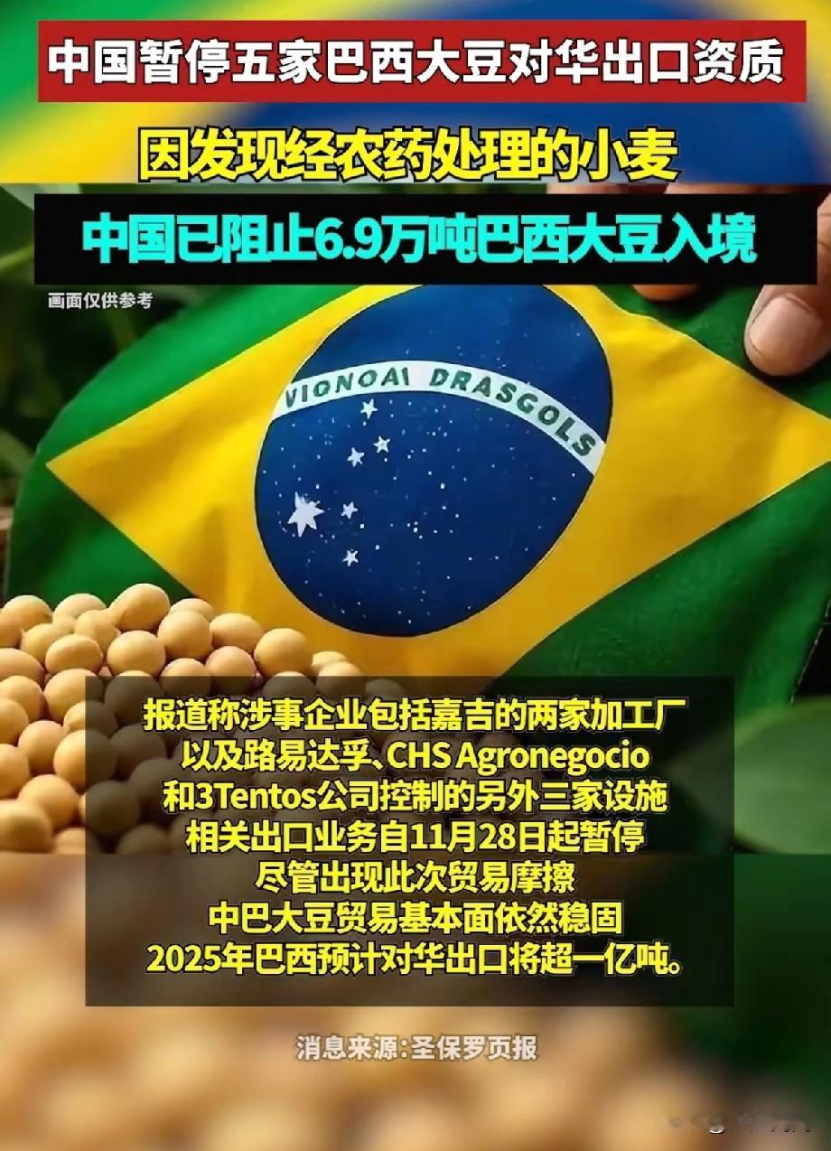 当一船满载6.9万吨巴西大豆的货轮靠泊江苏泰州码头时,谁也没想到,大豆中混入了约10吨 剧毒农药处理的小麦,五家涉事巴西企业被中方点名,出口资质暂停。这可不是小事,毒麦若流入市场,后果不堪设想,0.5克农药残留就能让成年人急性中毒,这是拿咱的健康开玩笑啊! 令人意外的是,出事的竟是路易达孚、嘉吉这样的大公司,为省成本不做深度清洁,想蒙混过关,却低估了中国海关的检测能力。中方果断暂停其资质,彰显了守护食品安全的决心。咱有先进的检测技术,粮食有“数字身份证”,任何违规都无处遁形。大家说,这是不是给那些不重视食品安全的企业敲响了警钟?