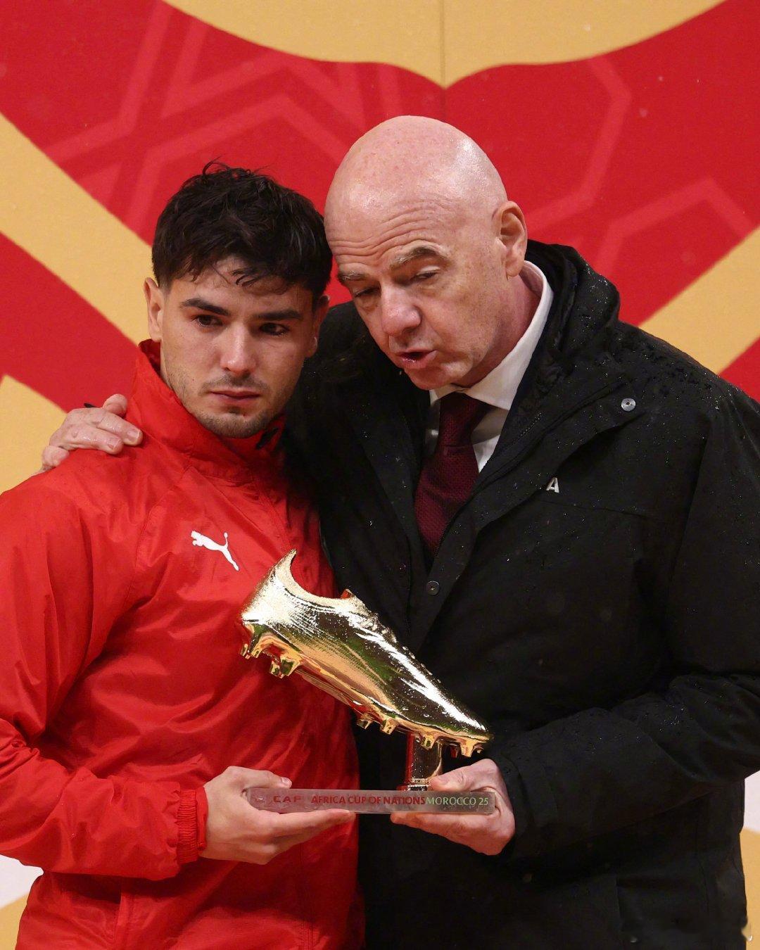 【非洲杯个人奖项公布!】塞内加尔夺得非洲杯冠军 ,马内获得赛事MVP,摩洛哥的迪亚斯获得金靴奖,摩洛哥的布努获得最佳门将奖。迪亚斯在决赛最后阶段点球不进,导致摩洛哥最终落败,FIFA主席因凡蒂诺亲自安慰他。
