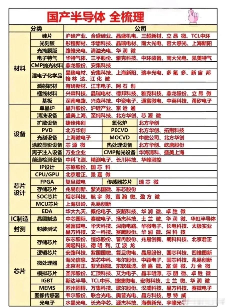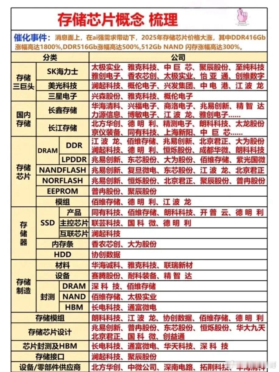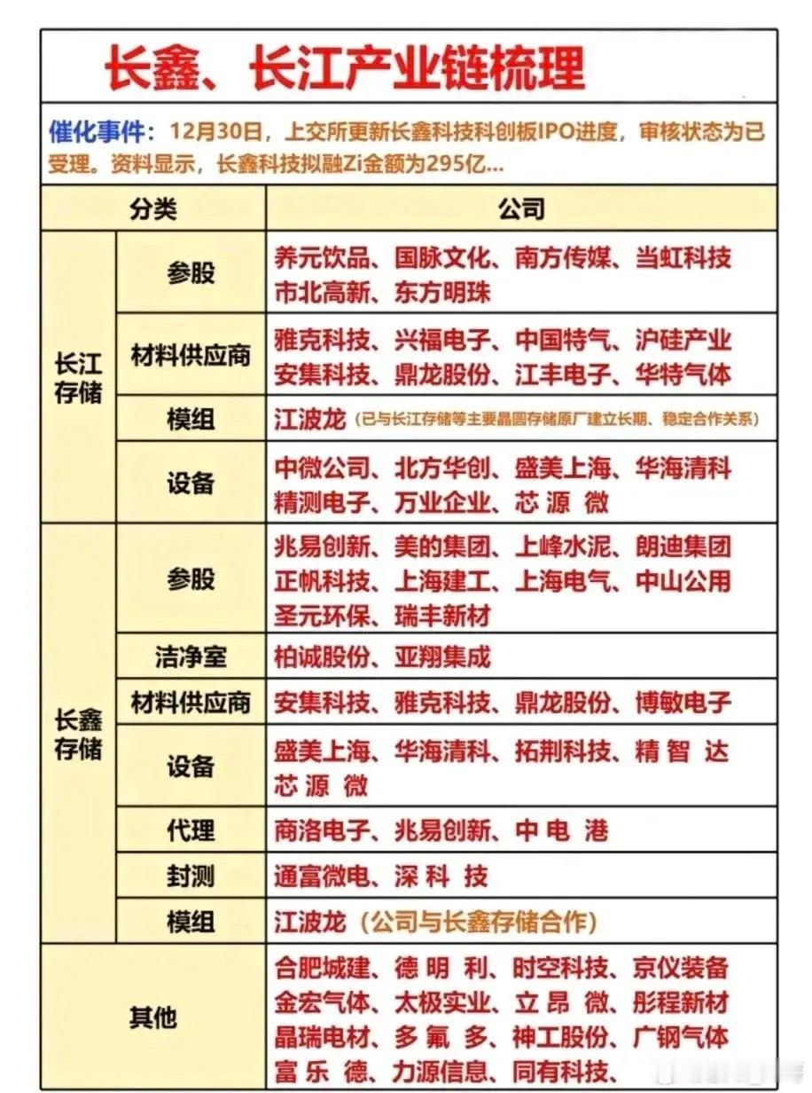 芯片国产替代利好来袭!周末利好半导体芯片领域利好密集释放,AI算力需求爆发驱动行业进入景气周期。美光等存储巨头推动存储芯片价格开启“超级周期”且封测环节报价上调30%,国内在高能离子注入机、芯片散热技术、新型半导体材料等关键领域实现国产化突破。叠加政策支持下国产替代加速推进,存储封测、半导体设备与材料、第三代半导体等产业链环节及相关A股龙头持续受益。长鑫存储有望成2026开年最大IPO,上市进程加速。长鑫、长江存储产业链全梳理来了!随着长鑫科技科创板IPO获受理,295亿募资加码DRAM技术升级,这条国产存储产业链的投资脉络愈发清晰。相关概念龙头代表名单见配图。存储芯片龙头代表梳理! 国际存储巨头:三星电子、SK海力士、美光科技;国内存储龙头:长鑫存储(DRAM)、长江存储(NAND Flash)等等。相关概念龙头企业名单见配图。在把握国产替代与AI算力红利的同时,也需警惕行业潜在风险。投资有风险,决策需理性。