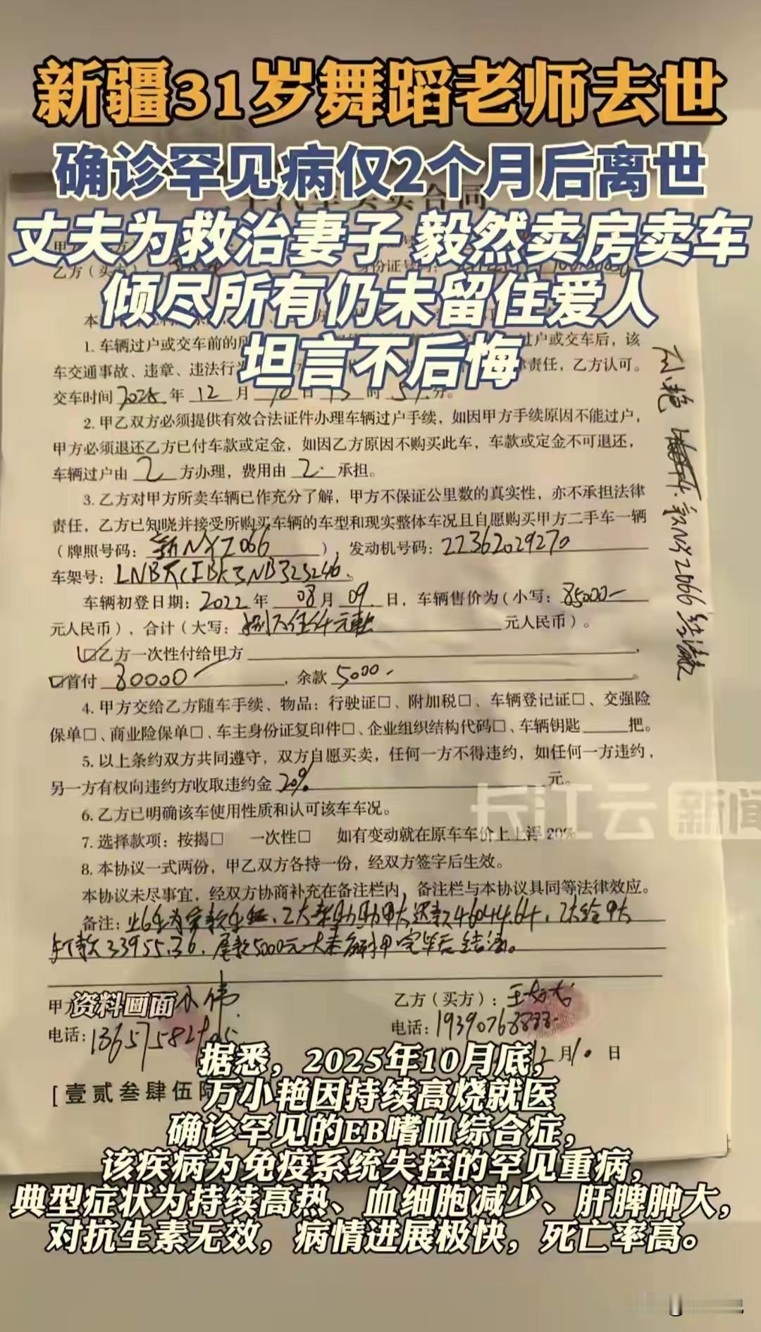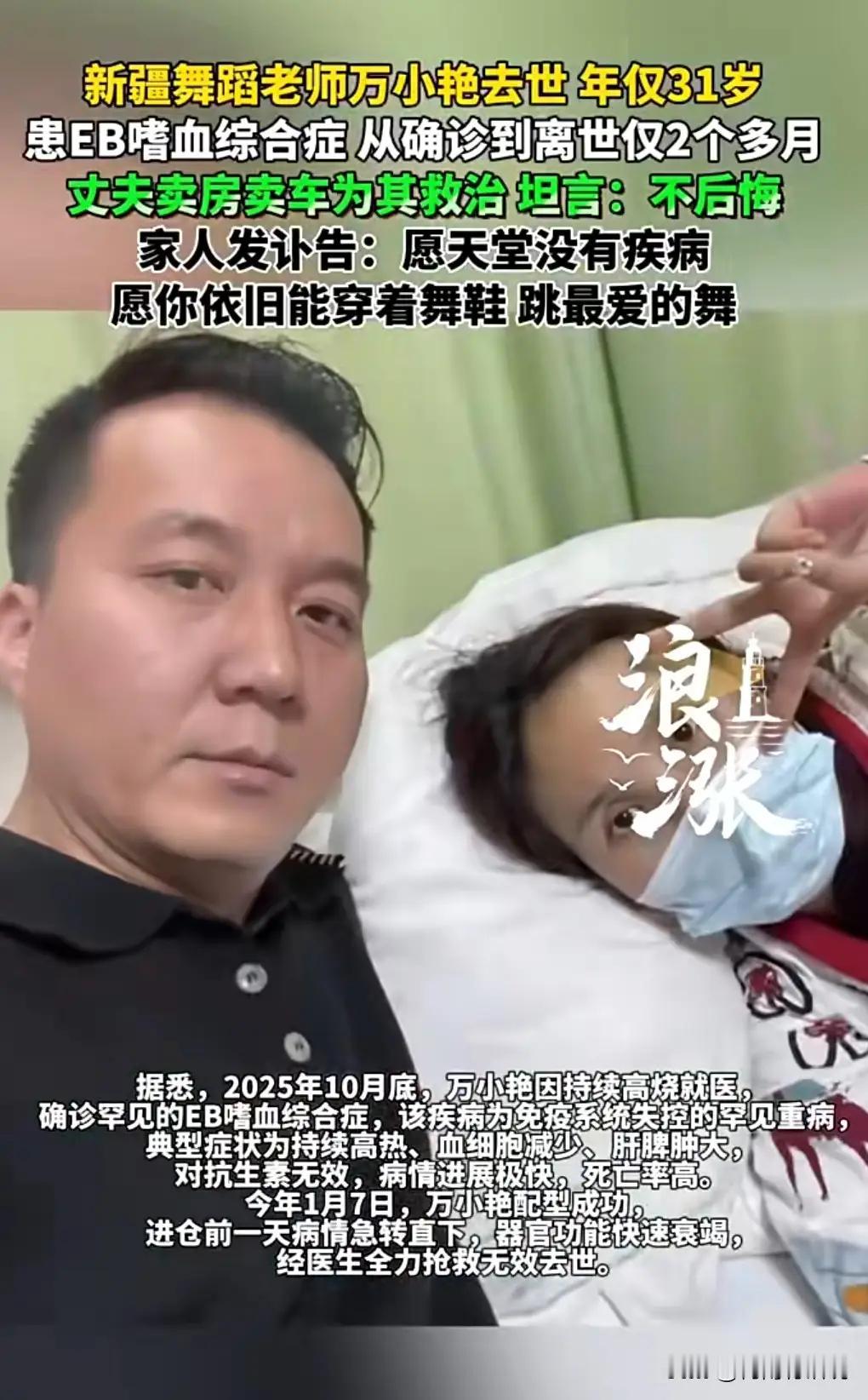 新疆31岁舞蹈老师患罕见病离世:丈夫卖房卖车倾尽所有,最后一舞刺痛千万人心,背后真相令人泪崩! 当生命进入倒计时,你会如何面对?新疆31岁的舞蹈老师万小艳,用她最后两个月的时光,写下了一段关于爱与绝望的残酷诗篇。从确诊罕见EB噬血细胞综合征到离世,仅七十余天。她的丈夫卖房卖车倾尽所有,却终究没能留住爱人离去的脚步。这不仅仅是一个疾病故事,更是一面镜子,照见了人性深处最脆弱也最坚韧的光芒。 万小艳的人生原本如她的舞姿一般绚烂。作为一名舞蹈老师,她站在聚光灯下,用脚尖旋转着青春的梦想。然而2025年10月底,持续的高烧将她推入命运的深渊。EB嗜血综合症——这个陌生而凶险的名词,像一把悬在头顶的利剑,瞬间斩断了她所有的未来。免疫系统失控,细胞因子风暴,医学术语背后是日夜不休的高热与急速衰竭的身体。 她的丈夫没有犹豫。房子卖了,车子卖了,积蓄掏空了。那张2022年才买的车,只换了8万元救命钱。他在病床前紧握她的手,说“不后悔”。这三个字轻如羽毛,却重如泰山。在这个充满算计的时代,有多少人能在绝境中依然选择倾其所有?他的背影,成了爱情最悲壮的注脚。这不是电视剧,这是真实发生在新疆乌鲁木齐某医院病房里,每分每秒都在上演的生离死别。 而比疾病更残酷的,是希望近在咫尺时的骤然破灭。2026年1月7日,配型成功的消息像一束光照进黑暗。进仓移植前一天,万小艳的病情却急转直下。器官功能快速衰竭,医生全力抢救的身影在监护室里晃动,最终化为心电监护仪上一条冰冷的直线。她终究没能穿上那双舞鞋,跳完生命中的最后一支舞。姐姐在讣告中写道:“愿天堂没有疾病,愿你依旧能穿着舞鞋,跳最爱的舞。”这句话让无数屏幕前的人瞬间破防。 翻开万小艳的抖音账号,400多条视频记录着她生前的明媚。她在练功房里旋转,在阳光下微笑,在课堂上耐心指导孩子。而她的姐姐“万老师”同样美丽动人,作为三家校区的主理人,她在妹妹离世后发出的那段亲吻屏幕的视频,让所有人看到了姐妹之间深如海的情感羁绊。这些鲜活的生命痕迹,与冰冷的死亡通知形成刺眼对比,让人不禁质问命运为何如此不公。 事件背后,更值得深思的是罕见病救治体系的脆弱。EBV-HLH发病率极低,但死亡率极高,很多基层医院甚至无法及时诊断。当普通人遭遇这种“医学盲区”,往往只能靠砸钱和运气搏一线生机。万小艳的遭遇不是个例,评论区里涌出大量类似故事:有人在北京友谊医院血液科陪护亲人,有人讲述朋友30多岁因同样病症几十天就离世。每一条留言背后,都是一个家庭在医疗重压下的挣扎与绝望。 与此同时,一场关于现代人健康危机的讨论悄然引爆。有网友质疑:“是不是过度节食导致免疫力崩溃?”有人感慨:“年轻人拼命工作学习,却亏空了身体本钱。”更有人尖锐指出:“当健康成为奢侈品,我们是否在用生命换明天?”这些声音混杂着焦虑与反思,戳中了当代人内心最深的恐惧——在快节奏生活中,我们是否正在透支唯一不可再生的财富:健康。 而在这场全民唏嘘中,一个不和谐的声音引发争议。知名人士宋清辉竟称“下辈子不要再当网红了,非常耗费精力”,将悲剧简单归咎于职业特性。这种言论立即遭到网友驳斥:“请不要用偏见消费逝者!”事实上,万小艳的抖音粉丝仅千余人,远非所谓“网红”。这种标签化解读,不仅伤害了逝者尊严,更模糊了事件真正的焦点——如何构建更完善的罕见病救助机制,如何让普通人在疾病面前不至于人财两空。 如今,万小艳的故事渐渐淡出热搜,但留下的思考远未结束。她的丈夫在收拾遗物时,是否会想起妻子旋转的裙摆?她的学生在练习舞蹈时,是否会记得老师最后的微笑?而我们每个旁观者,是否该重新审视自己的生活:那些熬夜加班的夜晚,那些忽略的身体信号,那些总说“明天再开始”的健康计划。生命脆弱如琉璃,经不起任何侥幸。 当夕阳西下,乌鲁木齐的舞蹈教室里或许还有音乐流淌。只是那个31岁的老师再也不会出现。她用生命跳完了最后一支舞,舞步沉重而震撼。这舞蹈关于爱情,关于亲情,关于医疗体系的短板,也关于我们每个人对生命的敬畏。请记住这个故事,不是为了一时的感动,而是为了让我们更珍惜眼前人,更认真对待自己的健康。因为有些告别,来得比想象中更猝不及防。 (来源 :综合都市现场、青岛新闻网、抖音@万老师、中华医学杂志及各大社交平台热议内容) 罕见病救治 生命最后一舞