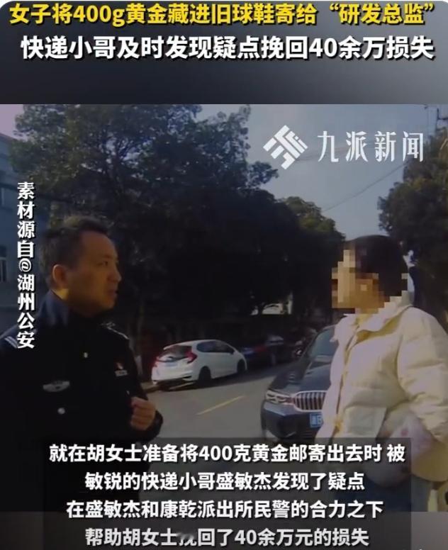 浙江湖州一女子要寄旧鞋,快递小哥在鞋内发现400克黄金,当场报警!警方:成功拦截高额诈骗案件,避免40余万元的损失 一双旧球鞋,凭什么比崭新的名牌鞋还重?浙江湖州快递小哥盛敏杰的一个多心眼,不仅揭开了藏在鞋里的惊天秘密,更硬生生拦下了一场40余万元的骗局! 那天,胡女士抱着一个鞋盒来到快递点,说要寄一双旧鞋到深圳。按规定开箱验视时,盛敏杰的手顿住了——这双看起来破旧的球鞋,拿在手里沉得反常。顺着鞋底的异样凸起摸下去,他从塞满的纸团里掏出了金灿灿的硬物,足足400克黄金,市值高达40多万!“你寄黄金做什么?”面对追问,胡女士眼神躲闪,慌忙取消订单就要走。 常年参加反诈培训的盛敏杰立刻警觉:这和民警反复强调的“黄金邮寄诈骗”特征一模一样!他当即上报网点并拨打110,反诈民警火速上门。可胡女士一开始还嘴硬,直到民警第二天再次登门,带着她去核实所谓“投资总监”的租房地址,发现身份证是伪造的、地址根本无人居住,她才彻底崩溃,道出了真相。 原来,她在网上结识了一位自称“科技公司研发总监”的男子,对方每天嘘寒问暖,还展示“内部投资渠道”的盈利截图,一步步获取信任后,以“国际黄金差价套利”为诱饵,让她买黄金邮寄过去。要不是这双旧鞋的反常重量,40多万的血汗钱早就成了骗子的囊中之物。 更让人揪心的是,这类骗局正在各地上演:青岛王女士被“完美男友”诱导,把75克黄金藏进运动鞋;康桥毛先生深信“稳赚不赔”,将200克黄金寄往骗子指定地址,幸好被民警紧急拦截。骗子们摸准了人性弱点——要么用“甜蜜陪伴”攻破情感防线,要么用“高回报投资”勾起贪念,最后都指向“买黄金邮寄”这个终极套路。 有人说快递小哥太较真,可正是这份“多问一句、多看一眼”的较真,守住了一个家庭的积蓄。反观骗子的手段,其实漏洞百出:哪有正规投资需要邮寄黄金?哪有素未谋面的“总监”会手把手带你暴富?可为什么总有人上当?说到底,还是“贪念”和“孤独”给了骗子可乘之机。 你身边有没有人遇到过类似的“投资诱惑”?如果是你收到这样的要求,会选择相信吗?欢迎在评论区聊聊你的看法,也别忘了转给家人朋友,提醒他们:天上不会掉黄金,只会掉陷阱!遇到可疑情况,记得拨打96110反诈专线!快递礼品骗局 黄金上门骗局