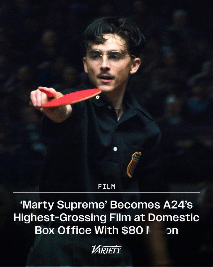A24票房新冠军诞生。凭借8000万美元的北美票房佳绩,《至尊马蒂》已正式超越此前由《瞬息全宇宙》(7700万美元)保持的纪录,加冕A24北美影史票房冠军。这部由“甜茶”提莫西·查拉梅领衔的剧情长片,目前全球票房累计已达9700万美元。尽管在全球总票房上暂居《瞬息全宇宙》(1.42亿美元)和《内战》(1.27亿美元)之后,但考虑到该片的海外发行策略较为从容,随着后续国际市场的逐步铺开,其最终票房表现依然值得期待。
