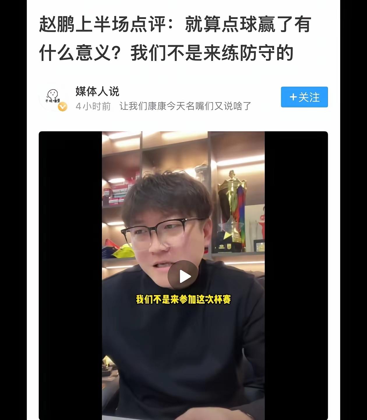 赵鹏又出来找骂了,还没被范志毅骂醒吗? 赵鹏说U23这样靠点球进四强没有意义,如果再输乌兹别克斯坦1:5就有意义了吗?这就是自大加一点臭,自己踢球的时候是什么德行不知道吗?典型的羡慕嫉妒恨,这就如同一个底层人经常讨论国家大事是一个心理,想想也是,脸都不要的人说出来什么话都是正常。 说这踢法难看的,应该都是岁数不大,没经历过意大利那个年代的年轻人,唯一不同的就是意大利队里有明星,相对来说没那么难看,效率更高,我个人觉得目前这个踢法还是比较符合我们自身的能力的,你让他们踢传控,踢穿插,他们踢不了啊,到时候输了,这帮人又是一副嘴脸了,赢球比啥都强,尤其是这种以弱胜强,绝地反击的这种更提气。