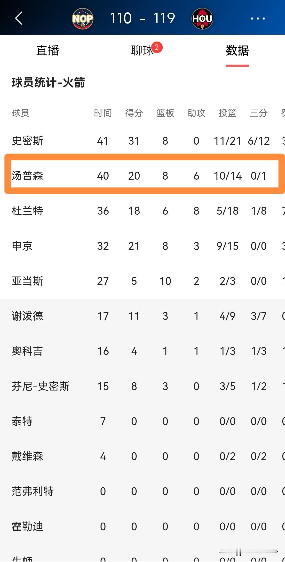 火箭新星阿门-汤普森真是太招人喜欢了!在今天火箭主场以119:110战胜鹈鹕的比赛中,攻防兼备的阿门再次打出了非常棒的表现,他在首发出战的40分钟里,投篮14中10,其中三分球1中0非常高效的砍下20分8篮板6助攻1抢断1盖帽,他的场上正负值为全队最高的+21。 本场比赛阿门屡次奉献非常精彩的暴扣,将自己出色的身体天赋展现的淋漓尽致,尽管阿门还没有开发出三分投射的能力,但是他的比赛已经极具观赏性了。