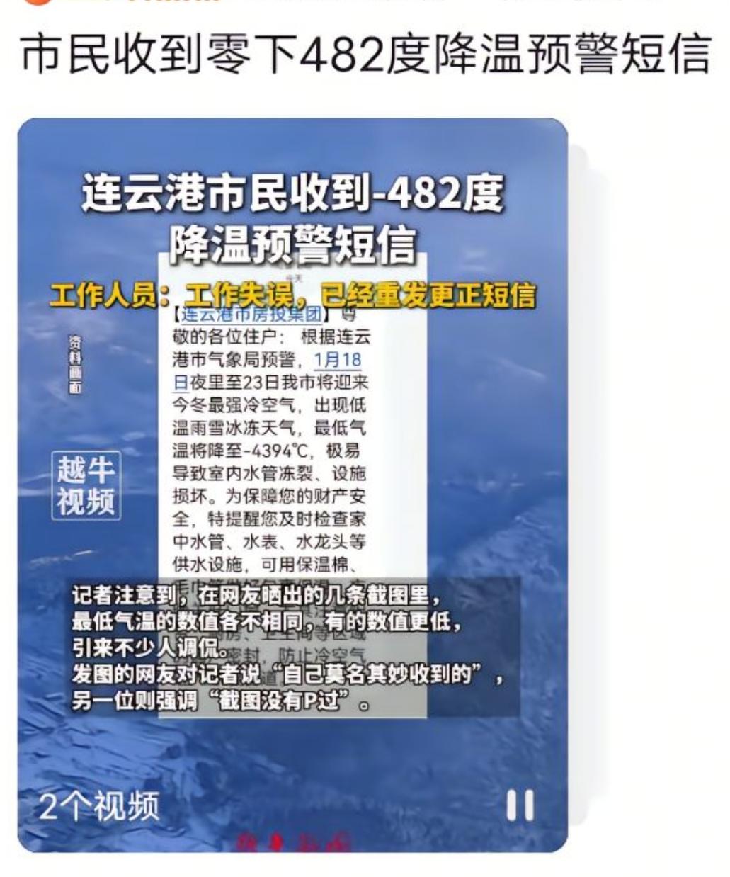 连云港气温将降至“-482℃”?“冰河时代”来了? 连云港人你们还好吗[流泪]。 1月16日,一位连云港网友晒出了一张天气预报截图,截图内容显示,18日至23日内或将遭遇最强冷空气,最低温度“高达”-482℃。 真会那么冷吗,不会的,-482℃是连云港房投集团工作人员的工作失误,要预警成真,连云港人还活不活了?!
