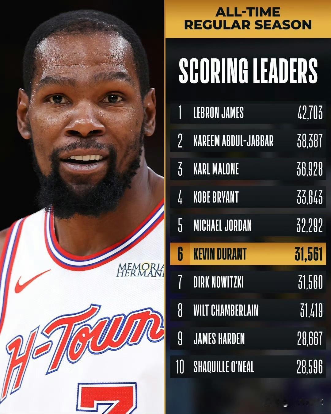 下一个就是乔丹了! 今天,主场作战的火箭队以119-110力克鹈鹕队,收获两连胜。本场比赛杜兰特手感不佳,18投仅5中,其中三分球8投仅1中,得到18分6篮板8助攻。虽然状态欠佳,但他仍然达成了一个重大里程碑,职业生涯总得分超越了独行侠队名宿诺维斯基,升至NBA历史第六位。 杜兰特的下一个赶超对象正是“篮球之神”乔丹,后者以32292分排名历史第五位,按照杜兰特赛季场均26.3分来推算,他有望在本赛季内完成对乔丹的超越,独享NBA历史第五位。目前来看,杜兰特生涯总得分进入历史前三名还有很大的难度,但超越科比坐四望三应该是板上钉钉的事实。当然,前提是要保持健康。
