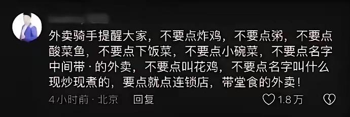 外卖小哥的点餐建议!保存收藏! 看了就知道,绝对是干货,第一,那些美其名曰的现炒现卖的都不要点! 要点就点知名的餐饮店,而且有可以在店里吃的就才行。 现在很多店都是在哪犄角旮旯找个地方专门送外卖,这种就要小心了。