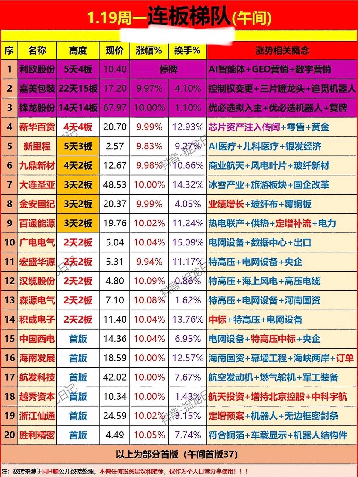 1.19周一连板梯队分析,强势股一览! AI智能体、机器人概念股领涨,特高压、电网设备、医疗板块活跃,多股连板涨停。