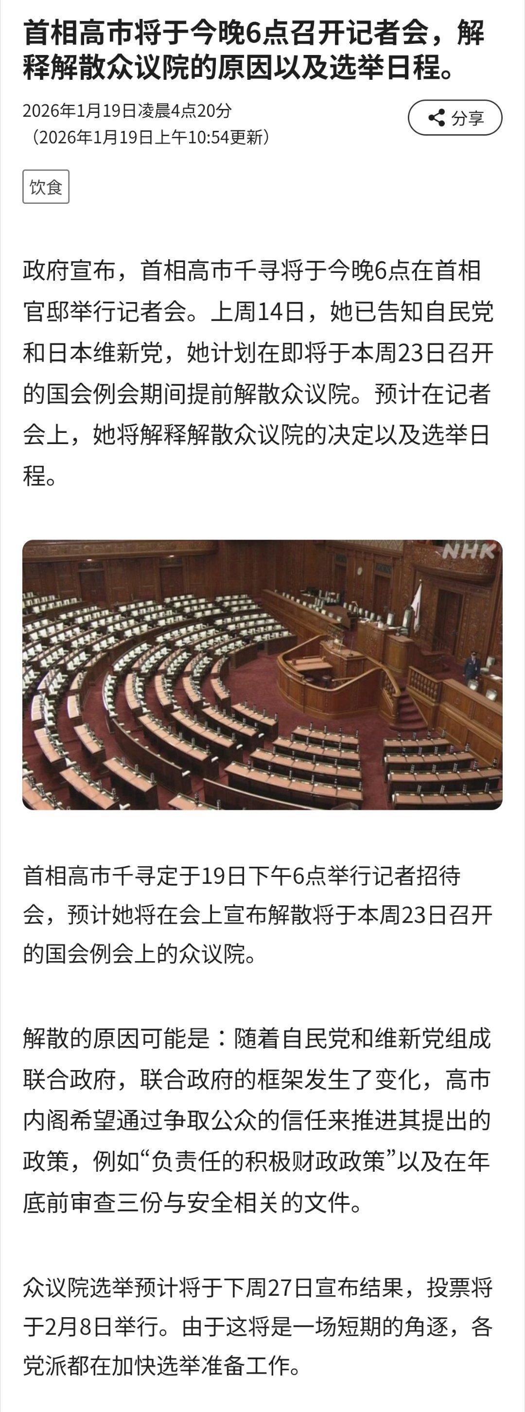 高市早苗考虑解散众议院高市早苗将于今晚6点召开记者会,解释解散众议院的原因以及选举日程