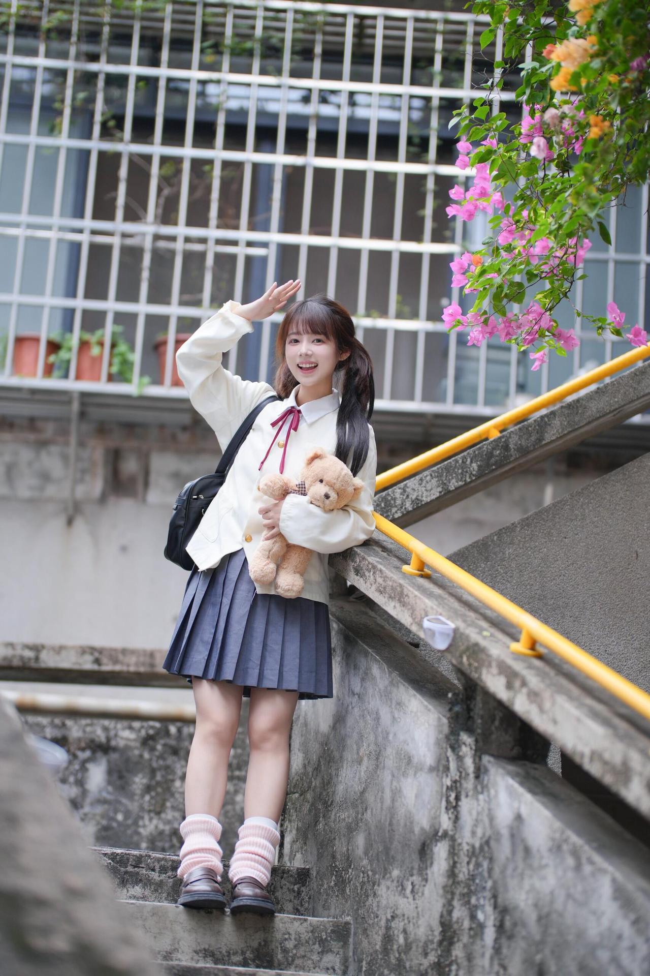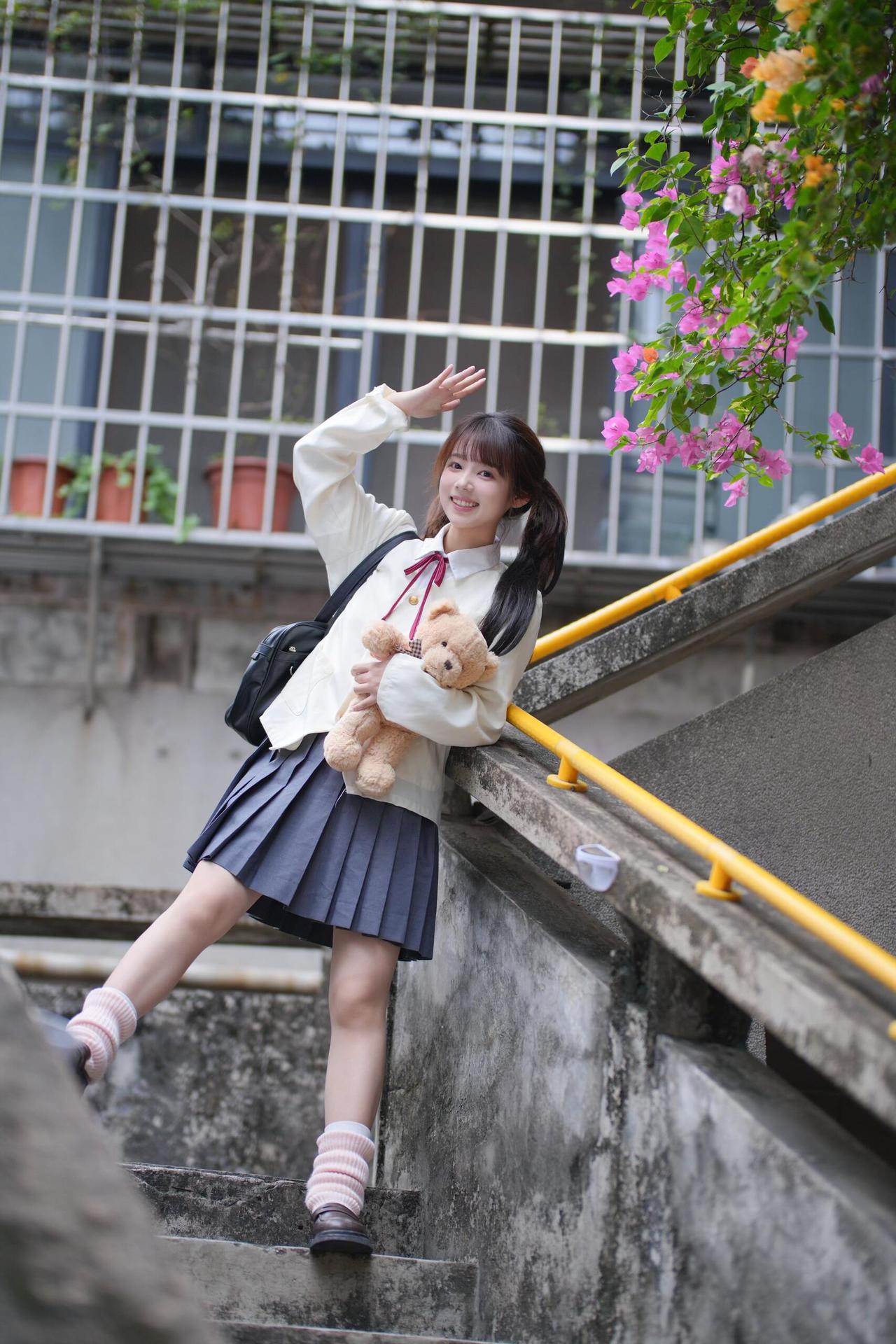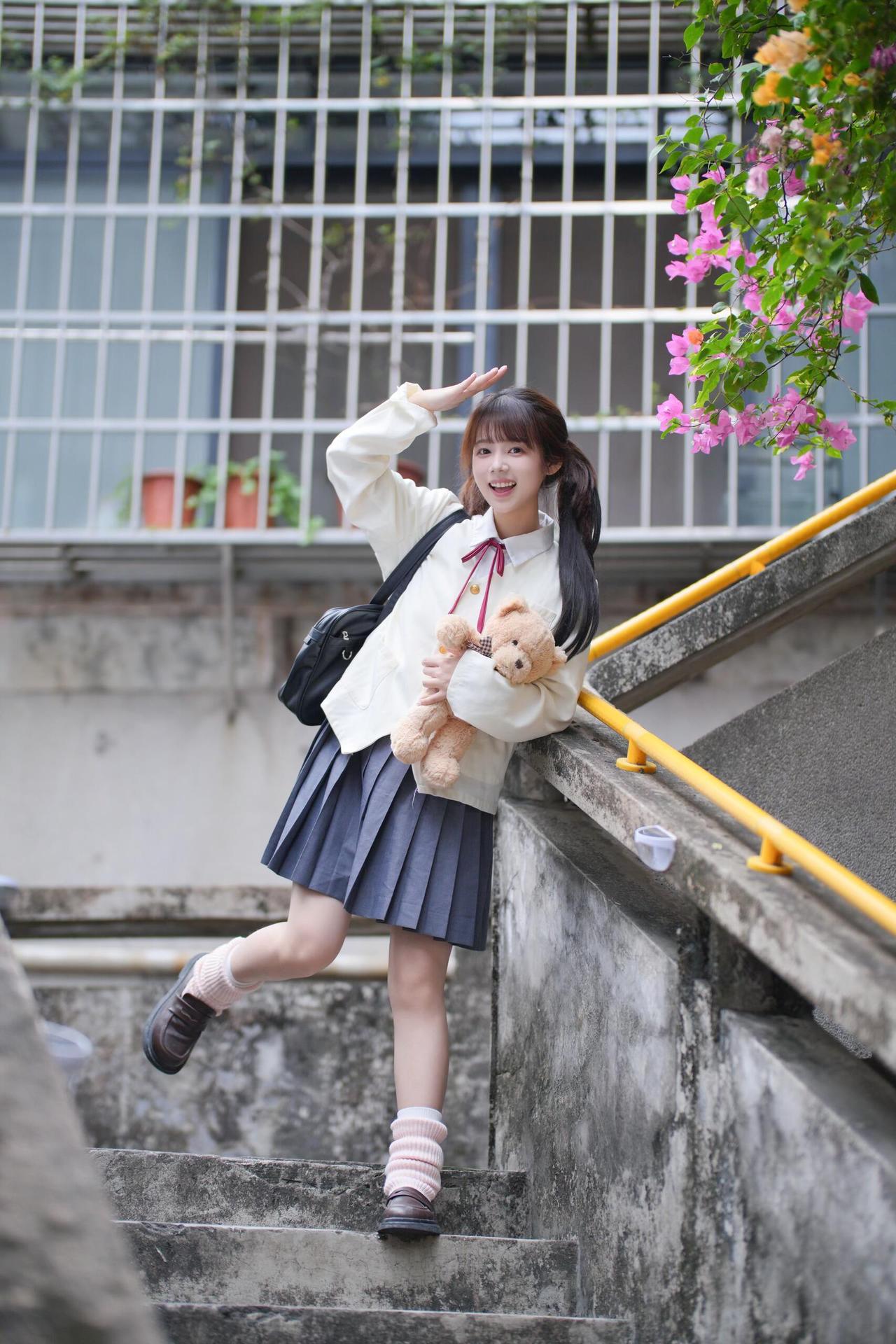 青春洋溢的校园少女,背着书包,手捧小熊,微笑着走上楼梯。