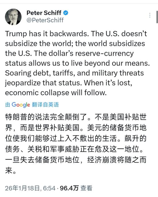 美国知名经济学家彼得·希夫北京时间1月18日晚写道:“特朗普的说法完全颠倒了。不是美国补贴世界,而是世界补贴美国。美元的储备货币地位使我们能够过上入不敷出的生活。飙升的债务,关税和军事威胁正在危及这一地位。一旦失去储备货币地位,经济崩溃将随之而来。” 美国经济学家彼得·希夫这话说得太实在了,直接戳破了美国的谎言。特朗普还在扯什么“美国补贴世界”,纯属颠倒黑白。真相就是世界在补贴美国,美元能当全球储备货币,才让美国有底气过着入不敷出的日子。 可现在美国自己瞎折腾,债务、关税、军事威胁全往一块儿凑,正在亲手毁掉这份特权,等哪天特权没了,美国经济就得垮掉。 可能有人不懂啥叫美元储备货币,说白了就是各国做生意、存外汇,大多都用美元。比如其他国家买石油、矿产,基本得先换成美元再交易;各国央行手里存的钱,也主要是美元。 这就给了美国天大的便利,它不用费劲搞生产、赚外汇,只要开印钞机印美元,就能买遍全球的商品。别的国家辛辛苦苦造东西换美元,美国光靠印纸就把好处拿了,这就是典型的寄生生活。 过去几十年,美国就靠这招过日子。国内要花钱了,就发国债、印美元,反正有各国接着。可这特权不是永久的,美国贪心不足,把路越走越窄。 最明显的就是债务飙得没边了,根据美国财政部的数据,现在美国联邦政府债务总额已经超过38万亿美元,距离突破37万亿美元才过去两个多月,增长速度快得吓人。 这么多债务,美国根本还不上,只能靠借新债还旧债,形成了恶性循环。更要命的是,债务利息都快压垮美国财政了,2025财年美国国债利息支出就高达1.2万亿美元。 钱都用来还利息了,民生、基建的钱就少了,可美国两党还在为选票互相拉扯,只想着增加福利、搞刺激政策,根本不管债务风险,这不是自掘坟墓吗? 除了债务,美国还爱挥舞关税大棒,以为这样能保护自己的产业,结果却是搬起石头砸自己的脚。这些年美国对多国加征关税,尤其是对中国,最高加到25%,可效果呢? 一点没遏制住贸易逆差,2024年美国国际贸易逆差反而涨到了9184亿美元,比上一年多了1335亿美元。更坑的是,关税成本最终都落到了美国老百姓身上。 穆迪公司早就算过,美国消费者承担了加征对华关税92%的成本,每个家庭每年因为关税要多花1300美元。2025年圣诞季更明显,很多节日礼物价格涨了两成多,居家用品甚至涨了近四成,关税让美国民众这季购物多花了280亿美元。 加关税不仅没保住就业,反而让美国各行业损失了14万到27.5万个岗位,制造业占GDP的比例还从2008年的12%降到了现在的10%左右,纯属得不偿失。 更愚蠢的是,美国把美元当成制裁工具,动辄就用冻结资产、切断结算通道那套打压别的国家。 俄乌冲突后,美国就冻结了俄罗斯的美元储备,这让各国都慌了神——原来把钱换成美元也不安全,说不定哪天就被美国扣了。于是大家都开始想办法摆脱美元,也就是常说的“去美元化”。 现在去美元化的势头越来越明显。国际货币基金组织的数据显示,到2025年二季度末,美元在全球外汇储备中的占比降到了56.32%,连续11个季度低于60%,创下30年来新低。 以前各国央行主要存美债,现在都开始增持黄金,2025年全球央行黄金持有量时隔近30年再度超过美国国债,金价一年涨了60%多,美元指数却跌了9.4%。 贸易结算上也在变,中国和巴西、印度和马来西亚都开始用本国货币结算,东盟国家也在讨论减少对美元的依赖。 各国买美国证券资产的热情也大减,2025年二季度,外资净买入美国证券资产才51亿美元,比上一季度下降了94.4%。大家都在悄悄远离美元,美国还没意识到问题的严重性,依旧靠印钱、加关税、搞威胁过日子。 彼得·希夫看得很透彻,美元储备货币地位是美国经济的命根子,可现在这命根子正在被美国自己毁掉。债务飙涨让各国不敢再放心持有美元资产,关税战搞乱了全球贸易,军事威胁和制裁又让大家对美元失去信任。等哪天各国都不用美元结算、不存美元储备了,美国就没法再靠印钱收割全球了。 到那时候,美元会大幅贬值,国内物价会涨得更凶,美国政府想借钱都没人肯借,融资成本飙升,企业倒闭、失业增加都会找上门来,经济崩溃就是必然的。 这不是吓唬人,是实实在在的趋势,美国现在的所作所为,都是在给自己的经济挖大坑,等跳进去就再也爬不出来了。 以前美国靠美元特权作威作福,以为能一直寄生下去,却忘了特权是各国给的,不是天生就有的。你天天欺负别人、透支信用,谁还愿意陪着你?现在各国都在慢慢远离美元,美国要是还不收敛,迟早会为自己的贪婪和霸道付出代价,到时候苦的还是美国普通老百姓。