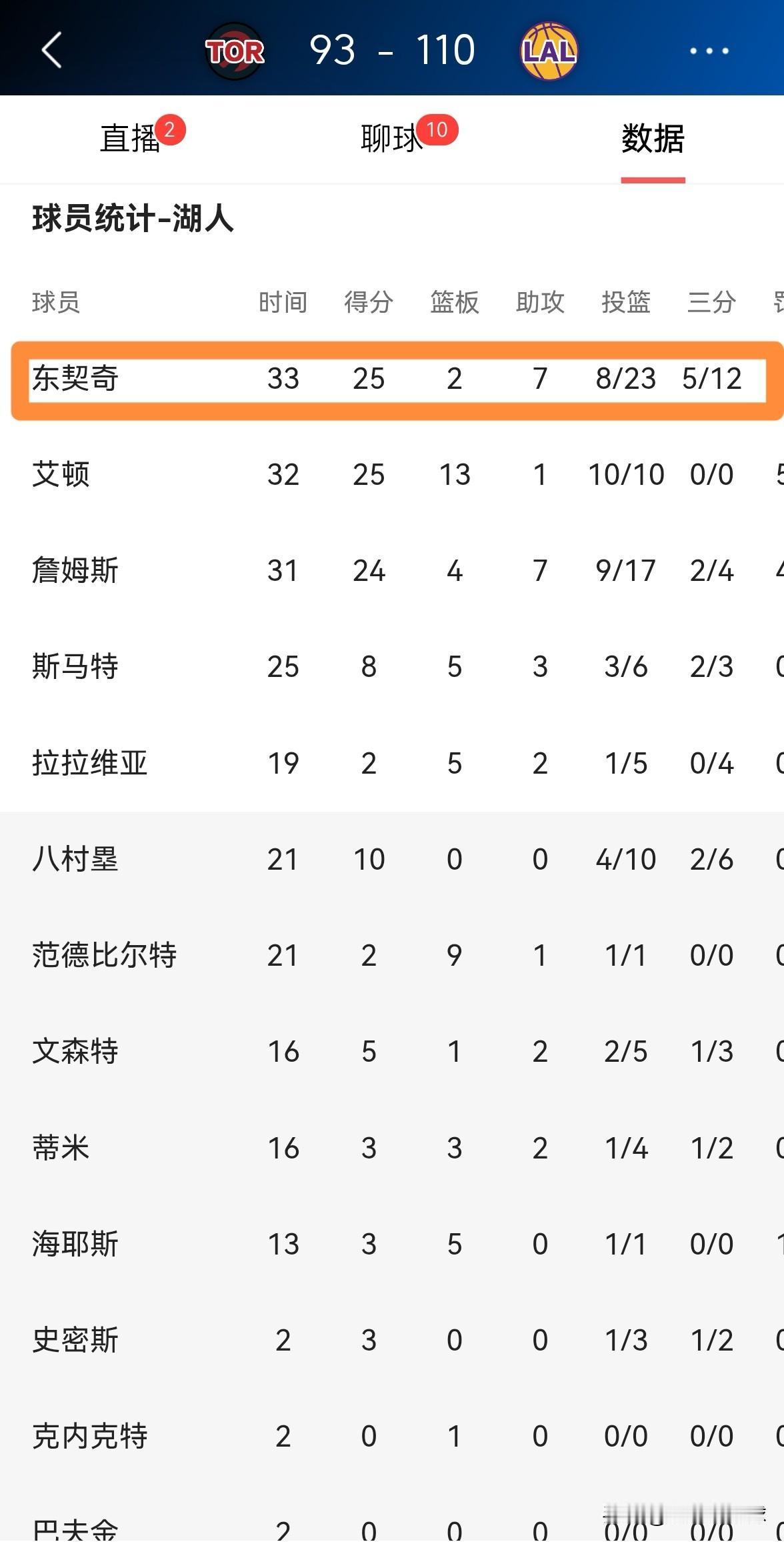 湖人当家球星东契奇真是让人忒失望了!虽然今天湖人在主场以110:93大胜猛龙,但是东契奇的进攻效率非常的低效,他在首发出战的33分钟里,投篮23中8,其中三分球12中5、罚球5中4非常低效的得到25分,还有4次失误,他的场上正负值为-3。 此外,本场比赛东契奇的得分和自己的赛季场均得分33.6分差了不少,东契奇应该再多出手10次才对,这样的话起码能够让自己的得分不低于赛季场均得分。