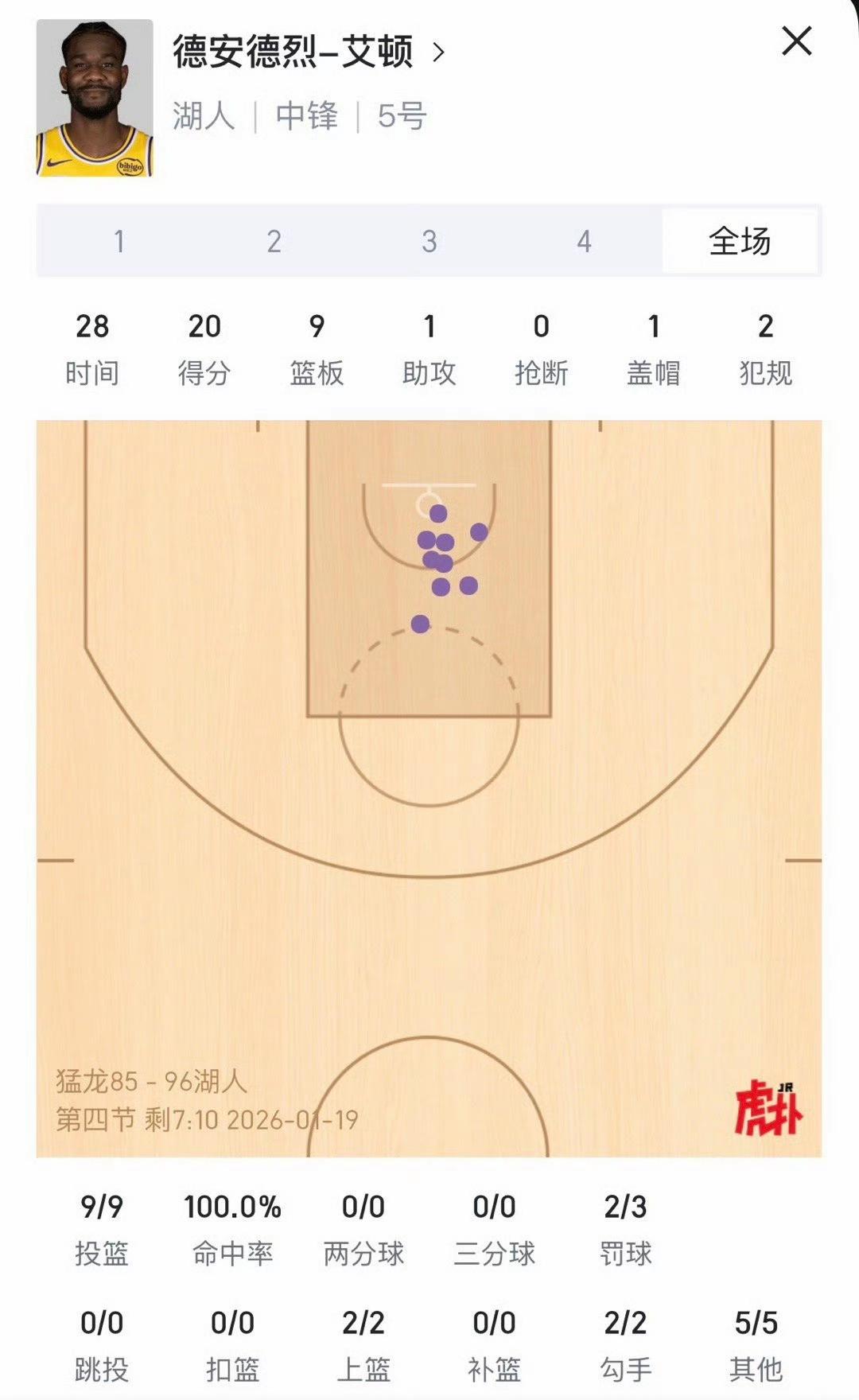 湖人该赢球了吧!湖人106-89领先猛龙16分,最后3分19秒。 湖人能不能赢球东契奇和詹姆斯是基本盘,艾顿是那个X因素,艾顿这场打得不错,20分9板,9投9中。 如果全场比赛只有25分钟,詹姆斯还是联盟顶尖。他的防守能力其实也还在,只不过全场让他又攻又防,体力确实跟不上。除了体力,其他真没任何毛病。