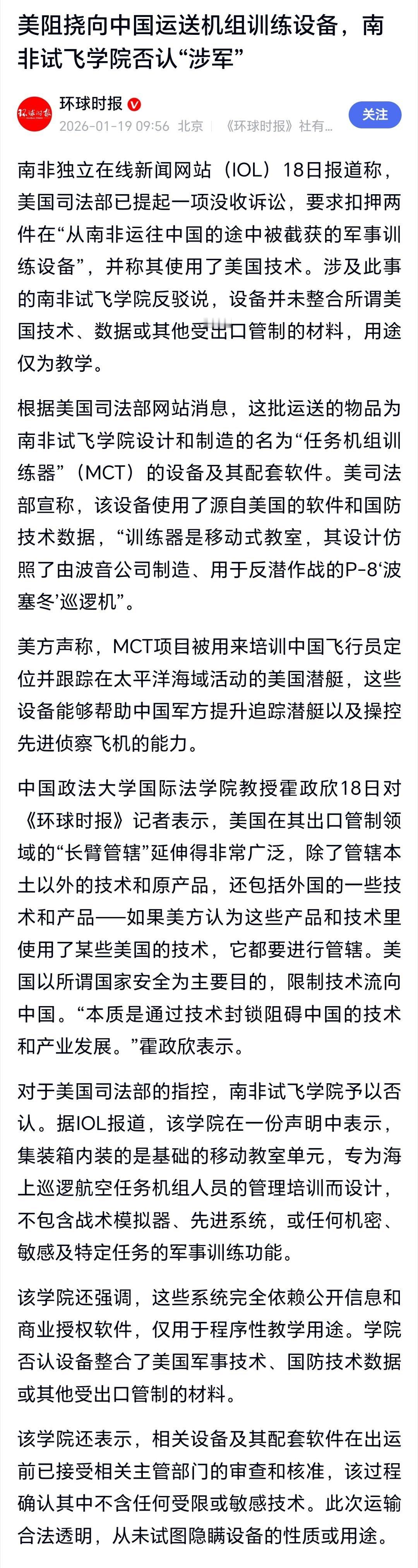 美阻挠向中国运送机组训练设备美司法部要求扣押两件“从南非运往中国途中被截获的军事训练设备”、涉及此事的南非试飞学院反驳说,设备并未整合所谓美国技术、数据或其他受出口管制的材料,用途仅为教学。