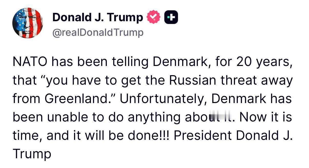 白宫转发了川普的发文: “北约20年来一直告诉丹麦: 你们必须消除俄罗斯对格陵兰岛的威胁。可惜的是,丹麦一直无能为力。现在是时候了,而且一定会做到!!!” 格陵兰之争,根本上是两大阵营之争,美国一直在以俄罗斯和中国威胁来为其获取格陵兰寻找合理性,尽管此文没有提到中国 - 在现在这个时点上,这也是有些微妙意味。