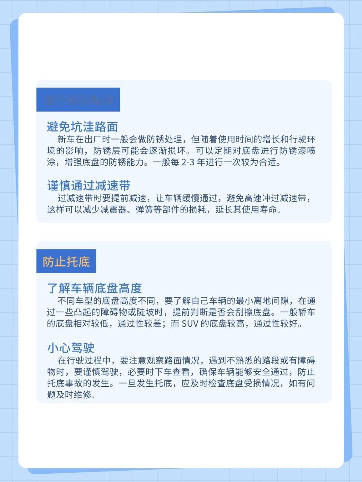 底盘是车的“骨骼”,养护好了能开得更久更稳!这几个底盘保养要点,很多车主都忽略了🔧🔍 定期检查是关键建议每5000公里或半年检查一次,烂路跑得多就得更勤。重点看:1️⃣减震器是否漏油2️⃣球头、拉杆、胶套有无松动磨损3️⃣底盘有无磕碰变形、螺丝松动🧼 清洁别只洗表面雨后、跑过泥泞或撒盐路面,尽快冲洗底盘,防止腐蚀,以及注意清理悬挂、缝隙等死角,泥沙堆积会加速磨损🛡️ 防锈处理延长寿命新车虽有防锈层,但会随时间磨损。建议:1️⃣每2-3年做一次底盘防锈漆喷涂2️⃣可考虑“底盘装甲”,防锈+隔音+防刮,尤其适合沿海、潮湿地区万一托底,及时检查油底壳、排气管等要害部位底盘养护不求频繁,但求及时。花小钱保养,省大钱维修,还能提升行驶质感和安全我与汽车的日常大v聊车