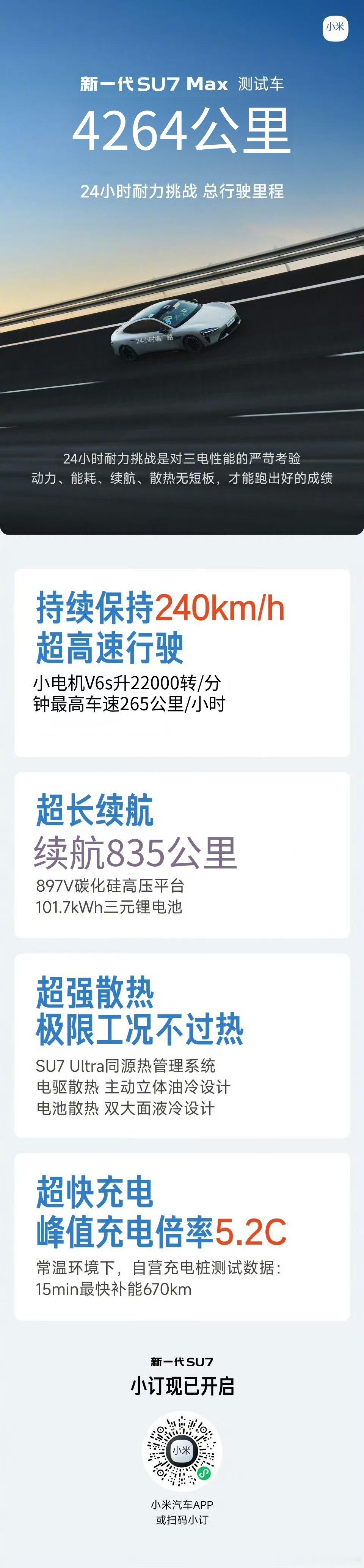 新一代SU7Max 测试车24小时耐力挑战,总行驶里程4264公里续航的感知还是