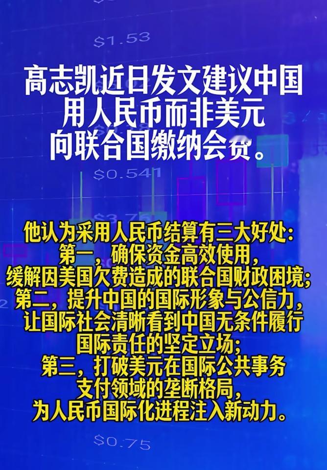 这几天很多自媒体在转载说高志凯提出,用人民币缴纳联合国会费。我去帮各位查证了一下,此消息属实。1月16日高志凯先生首次提出该观点,日被大家积极转载。如果该方案能够落实,不仅能减少中国的汇率损失,还能缓解联合国因美国长期欠费导致的财政困境;同时,这也是推动人民币国际化、打破美元霸权的重要一步。并且还可以逐步推广到国家援助,进一步扩大人民币的使用范围。