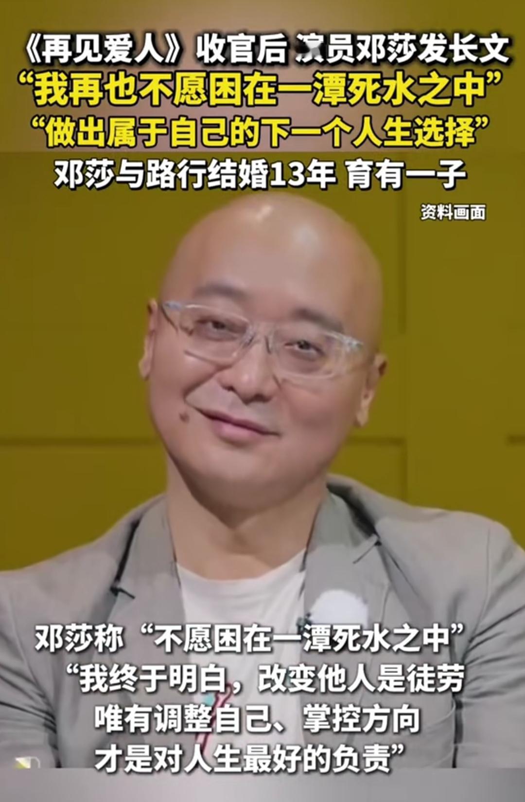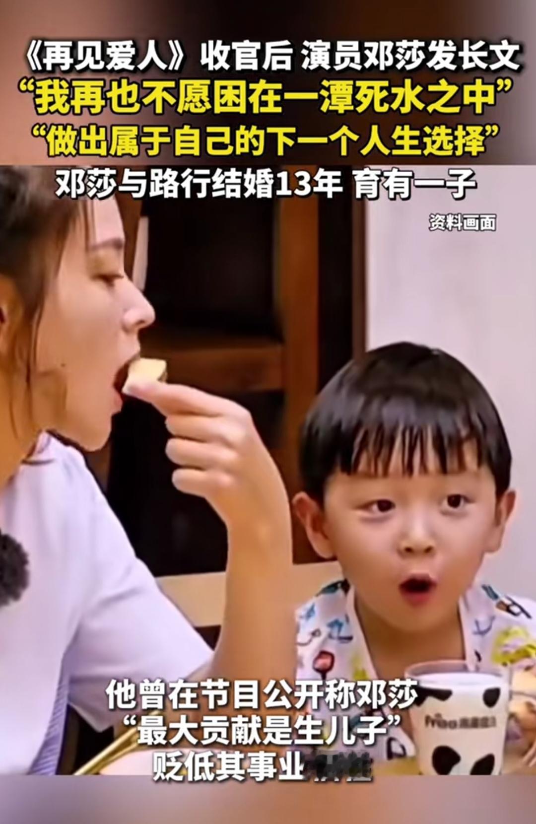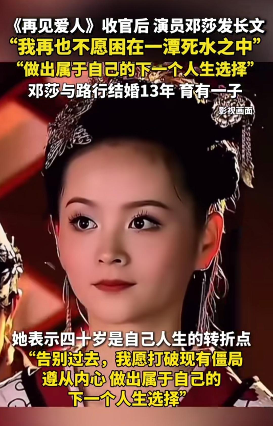 《再见爱人》刚收官,邓莎的长文就戳中无数人——“我再也不愿困在一潭死水之中”。13年婚姻、育有一子,曾经的相伴如今成了窒息的牵绊,这句话像说透了所有在关系里挣扎的人的心声。 节目里路行那句“她最大贡献是生儿子”,把她的事业牺牲踩得稀碎。如今她终于坦言“改变别人是徒劳,调整自己才是负责”,四十岁成了转折点,哪怕没提“离婚”,“告别过去、打破僵局”的字里行间,全是和过往的切割。 有人心疼她熬了这么久,有人说这是清醒的勇敢。13年的婚姻牵绊,到底是该妥协还是转身?来评论区聊聊吧。