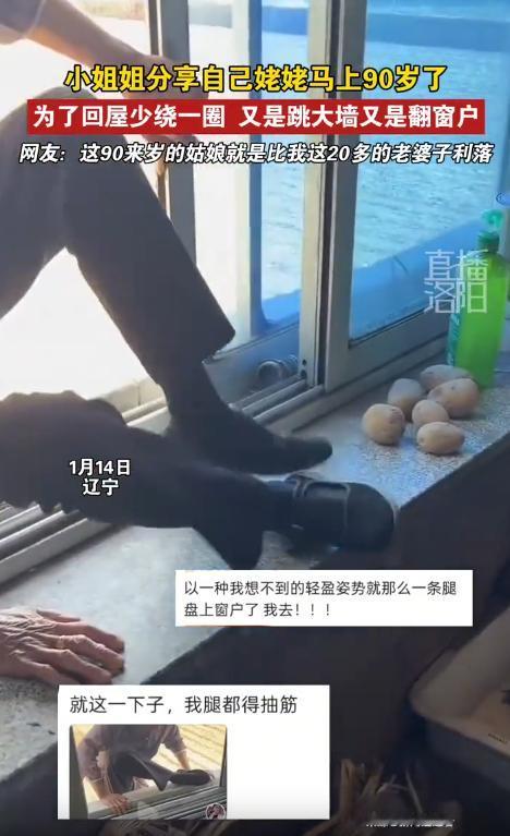 1月14日辽宁一小姐姐分享自己姥姥马上90岁了,为了回屋少绕一圈 又是跳大墙又是翻窗户。网友:这90来岁的姑娘就是比我这20多的老婆子利落! 1月14日,辽宁一位小姐姐分享的家庭视频,在网络上彻底火出了圈。视频里,她那位马上就要90岁的姥姥,为了回屋少绕一段路,竟当场上演了跳大墙、翻窗户的“硬核操作”, 动作行云流水毫不拖沓,看得网友们纷纷惊呼,这90来岁的姑娘,可比自己这20多岁的老婆子利落多了。 小姐姐透露,视频拍摄当天,姥姥像往常一样在院子里晒太阳、活动筋骨,待了一会儿想回屋歇着。原本从大门走需要绕着院墙转小半圈,姥姥嫌麻烦,目光扫过不高的院墙后,当即就决定抄近路。 全程没有丝毫犹豫,也没征求家人意见,转身就朝着院墙走去,那股干脆劲儿,完全不像近九旬的老人。 只见姥姥先伸手扶住院墙顶部,双脚微微用力一蹬地面,身子就轻巧地向上抬起,借着手臂的力量顺势翻上墙头,动作稳当又迅速,没有一点拖泥带水。 站在不宽的墙头上稍作停顿,确认好窗户的位置后,她慢慢挪动脚步调整姿势,随后俯身将身子探向窗边,双手牢牢抓住窗框边缘,缓缓将身体放了下去。 整套跳墙翻窗的动作一气呵成,从蹬墙、翻墙到落地进屋,全程不过十几秒,全程身姿挺拔,压根看不出岁月在她身上留下的笨重感。 小姐姐站在一旁看得又惊又笑,赶紧用手机记录下这一幕,原本只是想留作家庭纪念,没曾想发到网上后,瞬间引发了全网网友的围观和热议。 熟悉姥姥的家人都习以为常,姥姥身子骨一直格外硬朗,平时在家闲不住,要么在院子里打理花草,要么自己出门散步,手脚麻利程度远超同龄人。 而且姥姥性格特别豁达,从来不管闲事儿,也不轻易为琐事纠结内耗,别人说些不爱听的话,她都当作没听见,主打一个心态松弛。 这份独特的生活态度,也成了姥姥的长寿小秘诀。她饮食作息规律,不挑食不忌口,更不被年龄束缚自己的行为,想做什么就大胆去做,心态永远像年轻人一样洒脱。 家人也从不会刻意限制姥姥的行动,只要确保安全,都会尊重她的想法,这份包容也让姥姥始终保持着乐观开朗的性子。 视频走红后,评论区里瞬间被网友们的调侃和赞美刷屏。有网友笑着留言,自己20多岁爬个楼梯都气喘吁吁,姥姥这身手简直碾压年轻人,妥妥的“老当益壮天花板”。 还有网友打趣,这90来岁的姑娘果然不一样,灵活性和果敢劲儿,比自己这常年久坐不动的20多岁老婆子强太多。 也有不少网友从姥姥身上感悟到了长寿的真谛,认为心态好才是最重要的,少内耗、不纠结,保持身心舒畅,比任何保健品都管用。 还有网友分享自家老人的趣事,坦言高龄老人的活力往往超出想象,适当的活动和松弛的心态,才是滋养身心的关键。 如今很多年轻人被工作和生活压力裹挟,常年久坐缺乏运动,身体素质反而不如老一辈。姥姥的这段视频,不仅带来了欢乐,更给大家提了个醒,无论年龄大小,保持积极的心态和适量的活动,才能拥有强健的体魄,活出属于自己的精彩。 姥姥跳墙翻窗的硬核操作,是岁月沉淀后的从容,更是乐观心态的体现。近九旬的年纪,依然能随心所欲做自己想做的事,这份洒脱与活力,足以让很多年轻人羡慕。生活的质感从不被年龄定义,保持热爱与松弛,就能活出不一样的精彩。 对此,你们有什么看法,欢迎评论留言~
