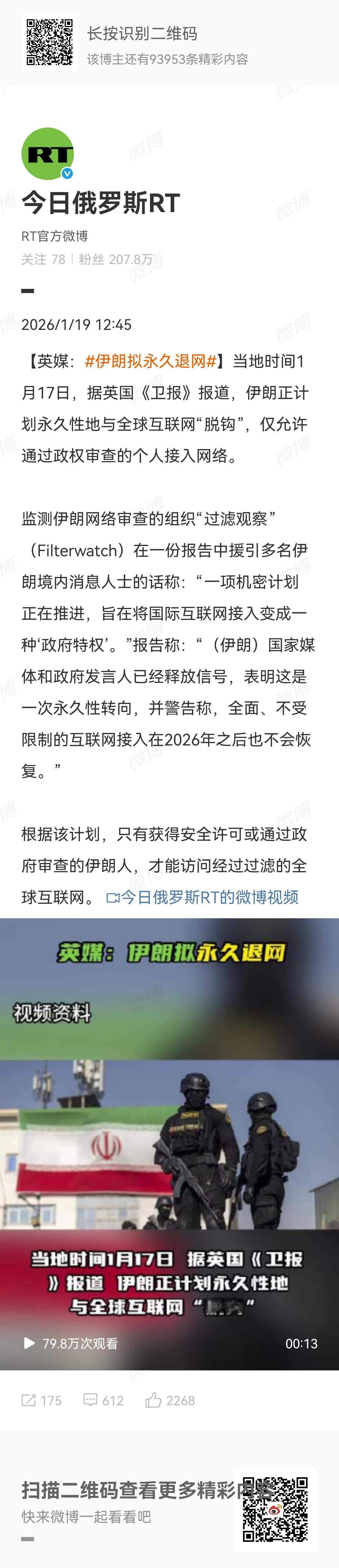 当地时间1月17日,据英国《卫报》报道,伊朗正计划永久性地与全球互联网“脱钩”,