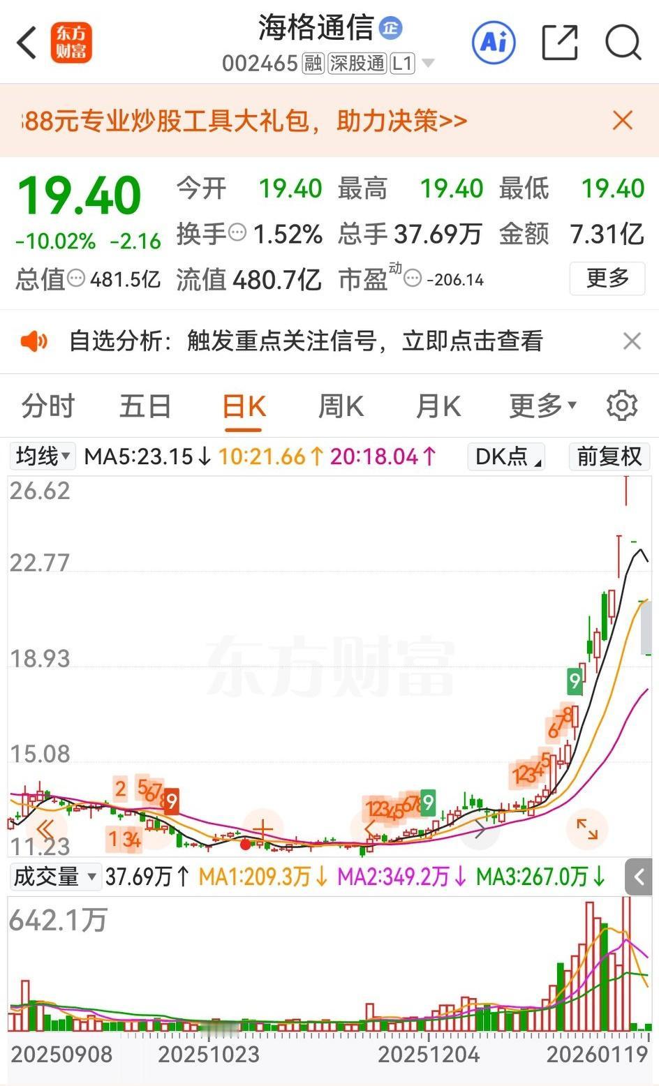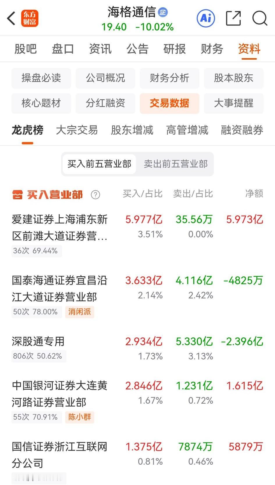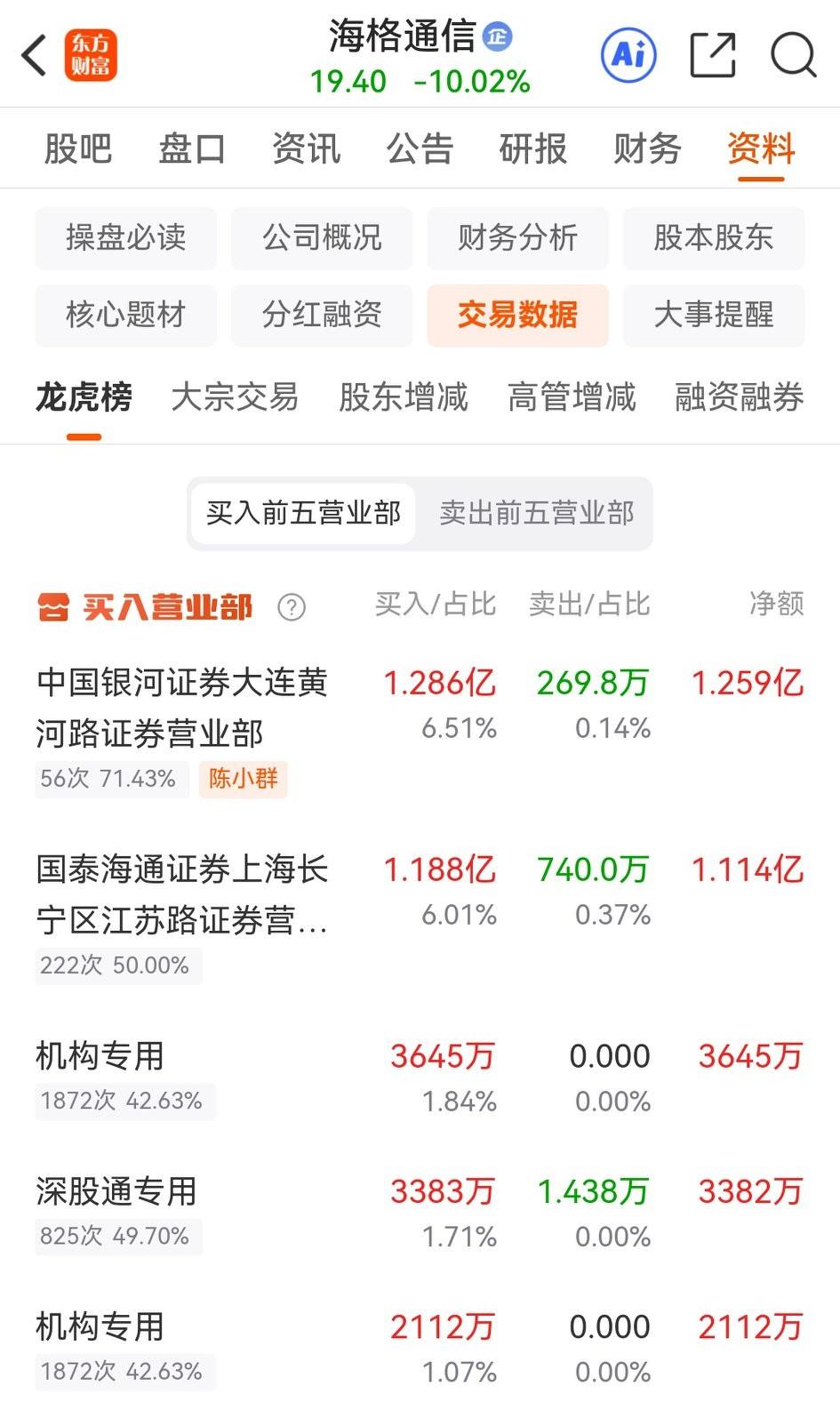 海格通信连续3个一字跌停,疑似要从哪里来回哪里去。有意思的是,龙虎榜显示,陈小群这三天买入净额1.28亿排名第一,也没将板上的抛盘撬开。 同样在榜单往前推,上周三他在最高点买入1.62亿,而12月29日出榜单以来,该股并无群总的身影,他大概率是高位上车做接力。 那么,这三天想撬板,群总是自救摊薄成本,还是为救他人展示义气?