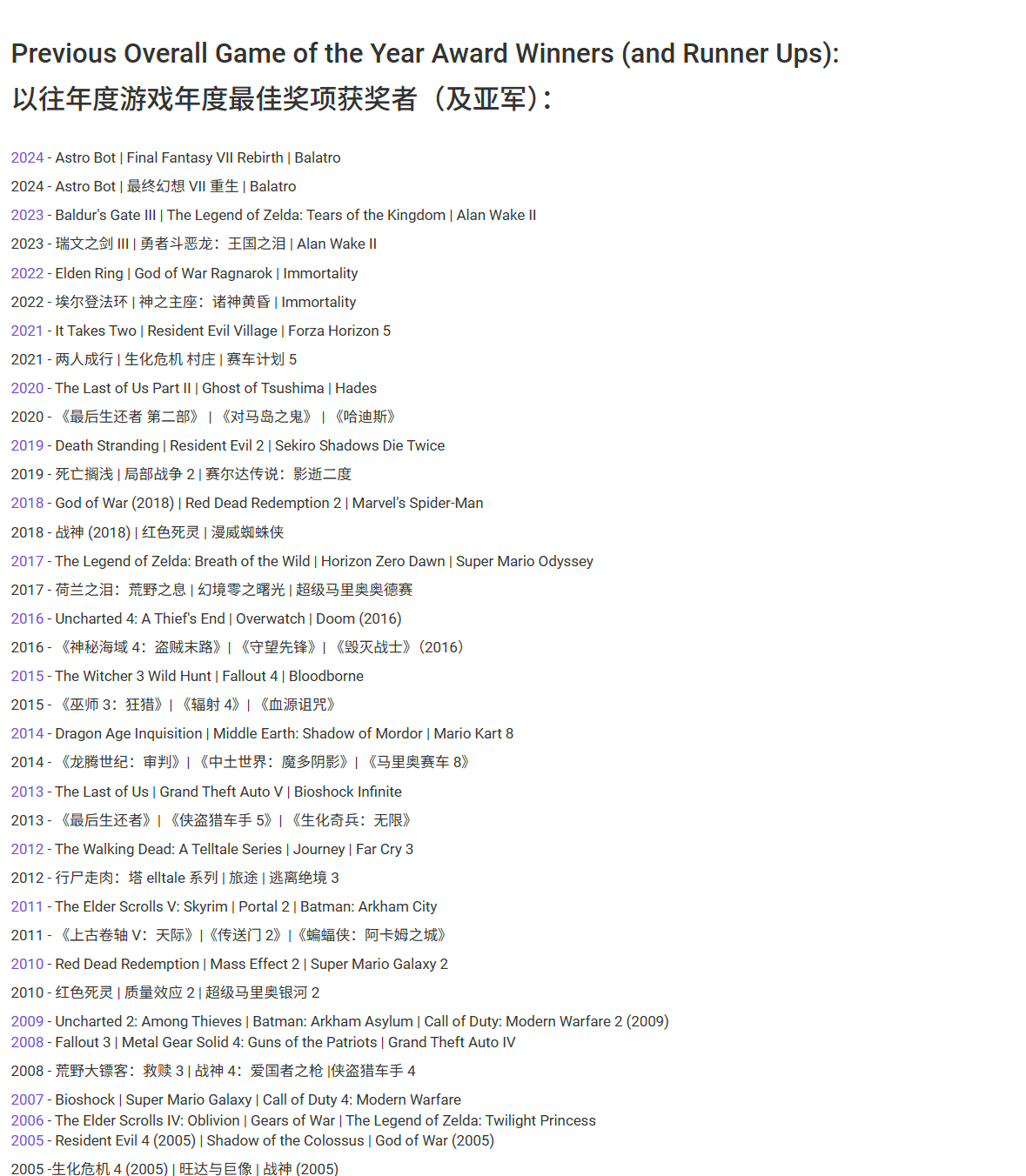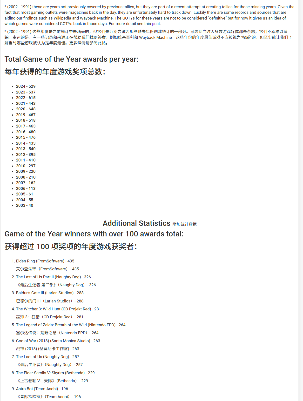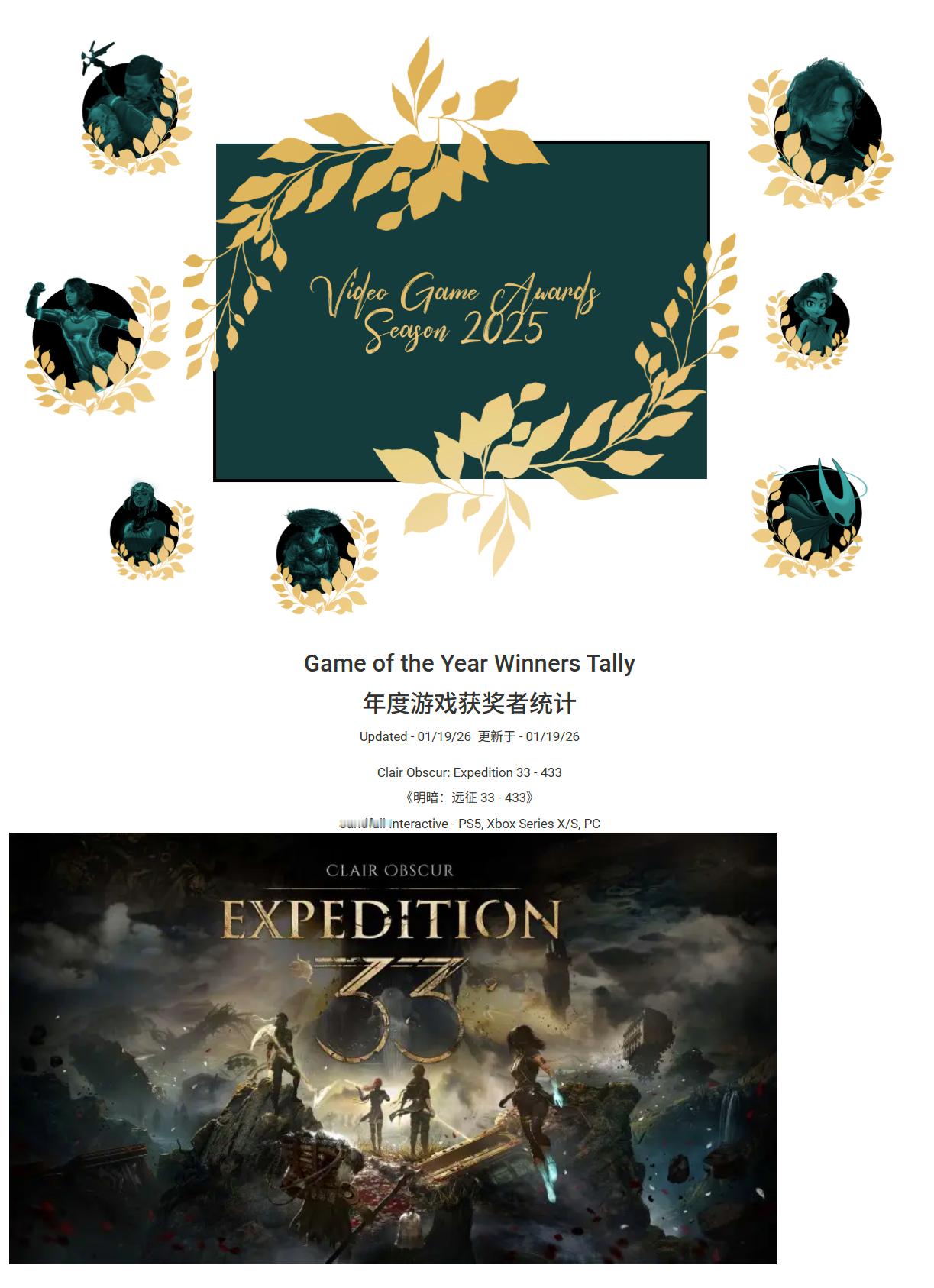 【2025年游戏大奖数统计:《光与影》横扫!直逼《艾尔登法环》】外网网友总结了2025年年度游戏获奖者统计,其中《光与影:33号远征队》已获奖433个,而历年获奖最多的是2022年的《艾尔登法环》获奖435个。2025年获奖游戏数量统计:《光与影:33号远征队》获奖:433《天国:拯救2》获奖:36个《空洞骑士:丝之歌》获奖:22个《咚奇刚:蕉力全开》获奖:15个《蓝途王子》获奖:14个《哈迪斯2》获奖:14个《死亡搁浅2》获奖:13个《羊蹄山之魂》获奖:10个《超英派遣中心》获奖:9个《寂静岭f》获奖:7个《双影奇境》获奖:5个《Arc Raiders》获奖:4个《马力欧卡丁车:世界》、《Despelote》、《一步一脚印》、《多重人生》获奖:2个《艾尔登法环:黑夜君临》、《真 三国无双:起源》、《鸣潮》、《燕云十六声》等游戏获奖1个