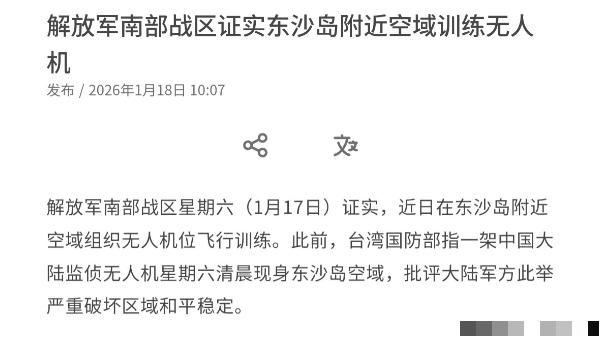 美国军舰刚经过台湾海峡,没想到解放军突然证实了一个大消息,这引起外媒格外的关注!1月18日,联合早报刊文声称,解放军南部战区已经证实,近日在东沙岛附近空域组织无人机位飞行训练。联合早报表示,此前,岛内指一架中国大陆监侦无人机星期六清晨现身东沙岛空域,批评大陆军方此举“严重破坏”区域和平稳定。 而我们解放军南部战区则回应称,近日,南部战区组织无人机在东沙岛附近空域进行正常飞行训练,完全正当合法。很显然,把这两则消息结合起来看,这背后的信息非同寻常。 根据央视新闻报道,1月16日到17日,美军“菲恩”号导弹驱逐舰和“西尔斯”号海洋测量船刚过完台湾海峡,东部战区立刻组织海空兵力全程跟监警戒,明确表示会坚决捍卫国家主权安全。 这边美军的舰艇还没走远,南部战区就公开证实了东沙岛附近的无人机训练,这种时间上的衔接,显然不是巧合,而是针对性极强的战略回应。 很多人可能对东沙岛不太熟悉,觉得这只是个小岛屿,其实它的位置关键到能影响整个台海和南海的局势。 这座面积只有1.8平方公里的小岛,距离广东汕尾大概260公里,正好卡在台湾海峡通往南海的航道中间,北距台湾高雄400多公里,西离海南岛600公里,相当于守在三大海域的十字路口。 更重要的是,这里每年有上万亿美元的货物经过,是国际航运的重要通道,同时也是解放军前出南海和西太平洋的战略咽喉。 军事评论员宋忠平就分析过,东沙岛不光是台海前沿,更是构建海上防线的关键节点,解放军在这里训练,本质上就是在自己的“家门口”练本领,完全合情合理。 而美军这次的行动,表面上是所谓的“航行自由”,实则暗藏玄机。“菲恩”号驱逐舰负责明面上的威慑,而“西尔斯”号海洋测量船一直在低速航行,其实是在偷偷收集台湾海峡的海底地形、洋流数据,这些信息都是为美军潜艇活动和后续军事部署做准备。 可就在美军过航台海前不久,美国刚公布了110亿美元的对台军售方案,包含海马斯远程打击系统等重型装备,这明显是在给“台独”分子递刀子,试图通过军事和经济双重捆绑,实现“以台制华”的目的。 面对这种挑衅,解放军的回应可以说是有理有据、张弛有度。南部战区明确表态无人机训练“完全正当合法”,这六个字既亮明了立场,也戳破了岛内势力的谎言。 要知道东沙岛自古以来就是中国领土,清代就纳入广东水师巡防范围,1946年中国政府也正式收复了这座岛屿,现在虽然由台湾地区实际控制,但改变不了它是中国领土的事实。 解放军在自己的领土附近组织训练,就像在家门口锻炼身体一样,根本不存在所谓“破坏和平稳定”的说法,岛内的指责不过是贼喊捉贼。 从军事角度看,无人机训练的意义远比表面看起来更深远。无人机最大的优势就是能长时间隐蔽侦察,还不会造成人员伤亡,特别适合在敏感区域执行任务。 这次训练不仅是在检验装备性能,更是在锤炼部队的实战能力,确保能随时掌握周边海域动态。 更重要的是,这标志着解放军在该区域的感知能力已经实现质的飞跃,能够构建起全方位的监控网络,这种“看得见、察得清”的优势,才是真正的战略威慑。 其实这一系列动作背后,传递的信号非常清晰:外部势力越挑衅,我们维护主权的决心就越坚定。 美军以为派军舰过台海就能给“台独”撑腰,殊不知这种行为只会让我们更加坚定地推进实战化训练。 现在解放军的应对已经形成了成熟的模式,东部战区负责台海方向的跟监警戒,南部战区在东沙岛等关键节点开展训练,海空联动形成立体防御,既展现了硬实力,又保持了克制,避免局势升级。 还要看到,美国内部对台海问题的分歧已经越来越明显,过半美国民众反对武力干涉台海,就连美国保守派评论员都直言“中国统一无可厚非”。 而两岸融合发展的趋势也不可阻挡,国民党副主席即将率团赴京重启国共论坛,这都说明“台独”分裂行径不得人心,统一是历史大势。 说到底,美军的挑衅和“台独”的叫嚣,不过是螳臂当车。解放军在东沙岛附近的无人机训练,既是对外部干涉的有力回应,也是维护国家主权的必然选择。 随着我们军事实力的不断提升,任何企图分裂国家的行为,都必将遭到坚决反制。 台海和平稳定的主动权,始终掌握在我们自己手里,任何外部势力都无法阻挡两岸统一的历史进程。