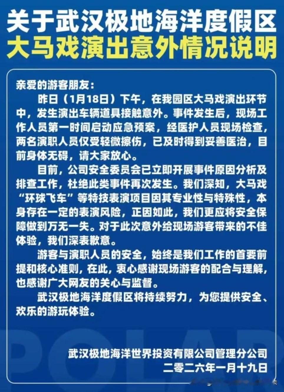 武汉极地海洋公园环球飞车表演突发碰撞事故!2名演职人员轻微擦伤,景区紧急回应 ——最新进展速报 事件速览 1月18日下午,武汉极地海洋公园大马戏团“环球飞车”特技表演环节突发意外。现场视频显示,4名演职人员在巨型球形舞台内骑摩托车表演时发生碰撞,多人摔倒在地。据景区通报,事故共涉及6名演职人员,其中2人因轻微擦伤被送医,经检查后当日出院,目前身体无碍。 事故详情与应急响应 1. 现场情况:事故发生时,表演区域与观众席严格隔离,现场无游客受伤。视频画面显示,摩托车在高速行驶中因道具接触发生碰撞,演职人员随即倒地,现场工作人员迅速介入处置。 2. 园方行动:景区第一时间启动应急预案,医护人员抵达现场进行紧急处理,并将伤者送往医院进一步检查。当晚,武汉极地海洋度假区发布官方情况说明,向公众致歉并承诺彻查原因。 景区回应与后续措施 1. 安全排查:景区安全委员会已成立专项小组,对事故原因展开全面调查,并强调将“强化安全保障措施,杜绝类似事件再次发生”。 2. 风险提示:景区坦言,“环球飞车”等特技表演因专业性高、风险系数大,需持续优化安全流程。 3. 致歉与承诺:园方对受影响的演职人员和观众深表歉意,并感谢公众监督,称将“以安全为首要准则,持续提升服务品质”。 网友热议 事件引发网友对特技表演安全性的关注,部分观众留言称“现场惊险,希望加强防护”,也有网友表示理解高风险表演的偶然性,呼吁理性看待。 最新进展 截至1月19日,景区已恢复“环球飞车”演出,但表示将加强设备检修与人员培训,确保后续表演安全。 小贴士 若计划前往观看,建议提前关注景区安全提示,并留意现场工作人员指引。 (本文综合自景区通报及权威媒体报道) 武汉极地海洋公园事故 环球飞车碰撞 引用来源:武汉极地海洋度假区官方说明、极目新闻、南都N视频等。